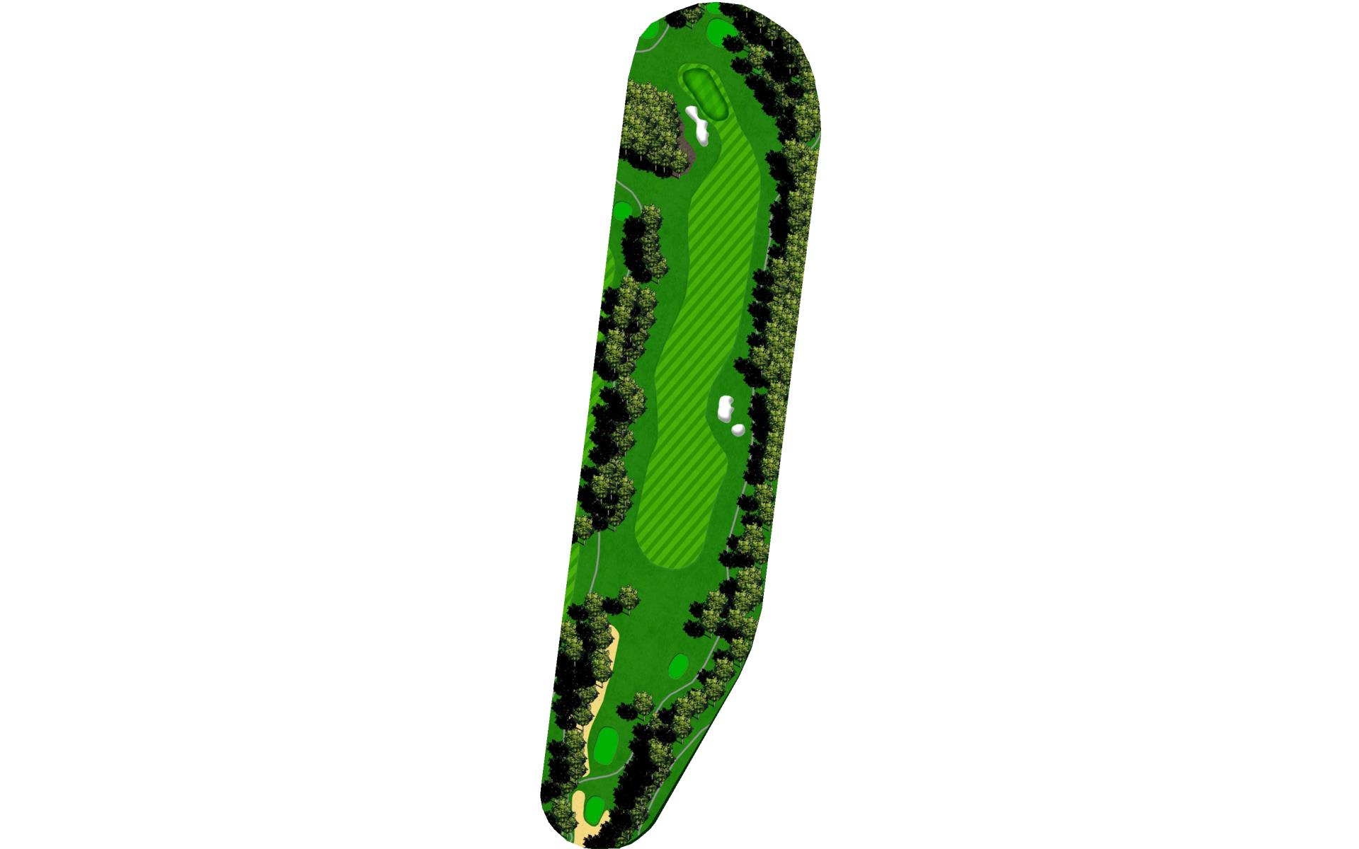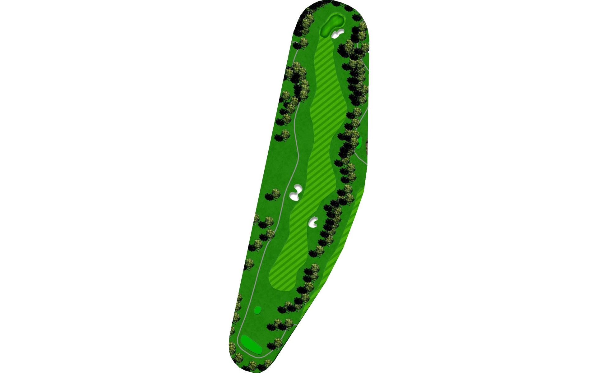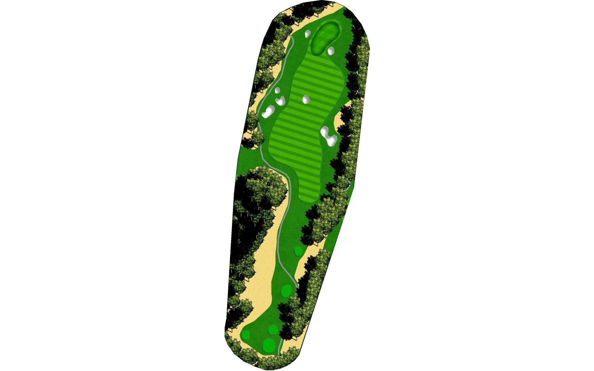 This par 5 slopes slightly uphill. The second shot slopes left-to-right, so players will want to keep their ball left to play from the center. The green is well-protected where the best miss is long and left.