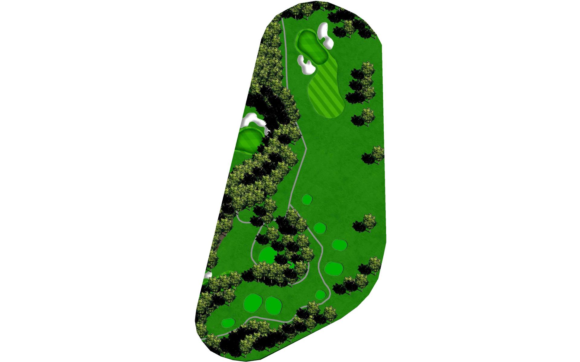 This par 4, eighth, slopes from left-to-right the entire way to the green. Longer hitters might be able to carry over to the right fairway, but precision will be required. A drive to the left fairway will leave players a longer shot into the green. The green is surrounded by slopes and bunkers, so the best miss is short.