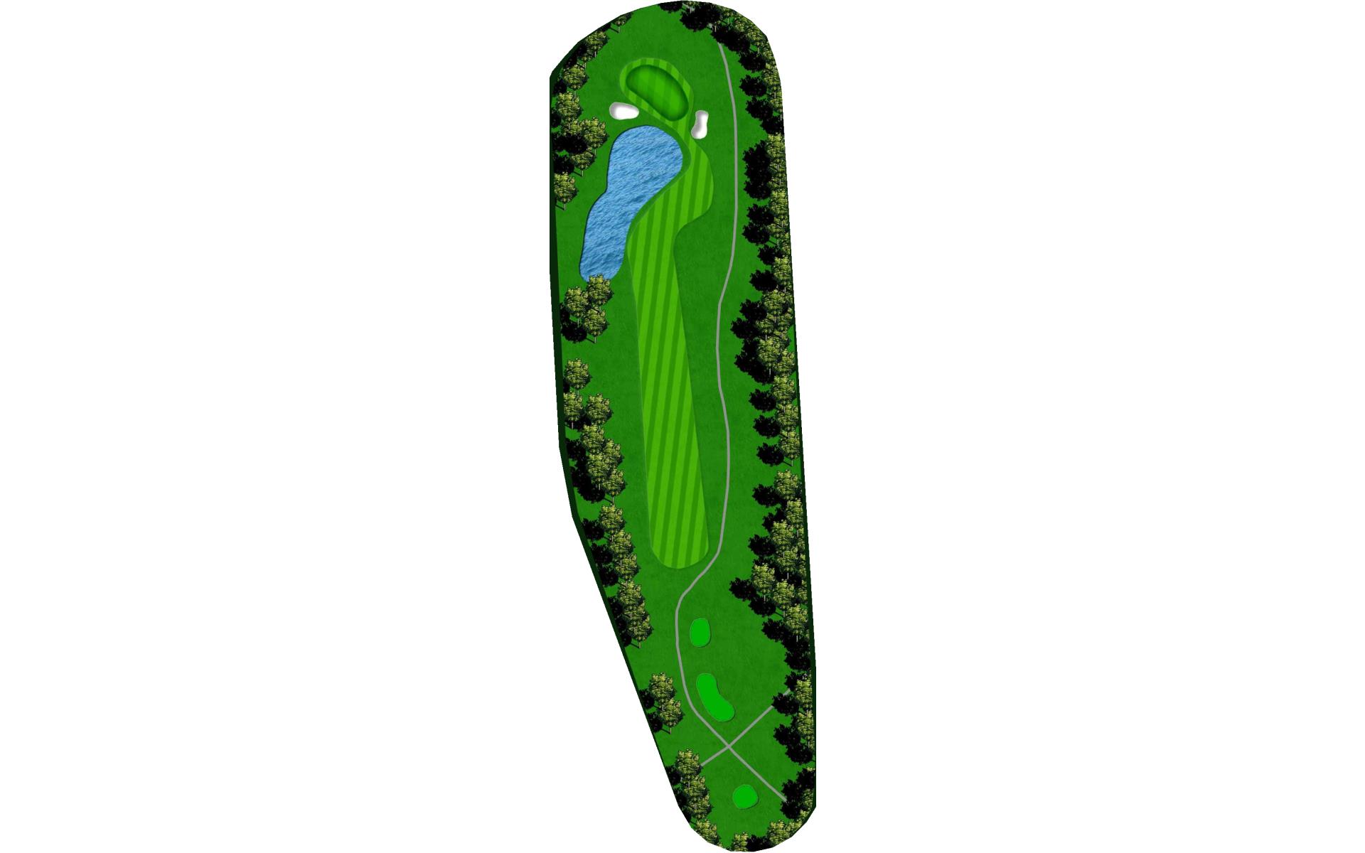 A short par 4 that requires an accurate tee shot of 180 to 200 yards. The approach shot is most critical, with a two-tier green and a pond short of the green.