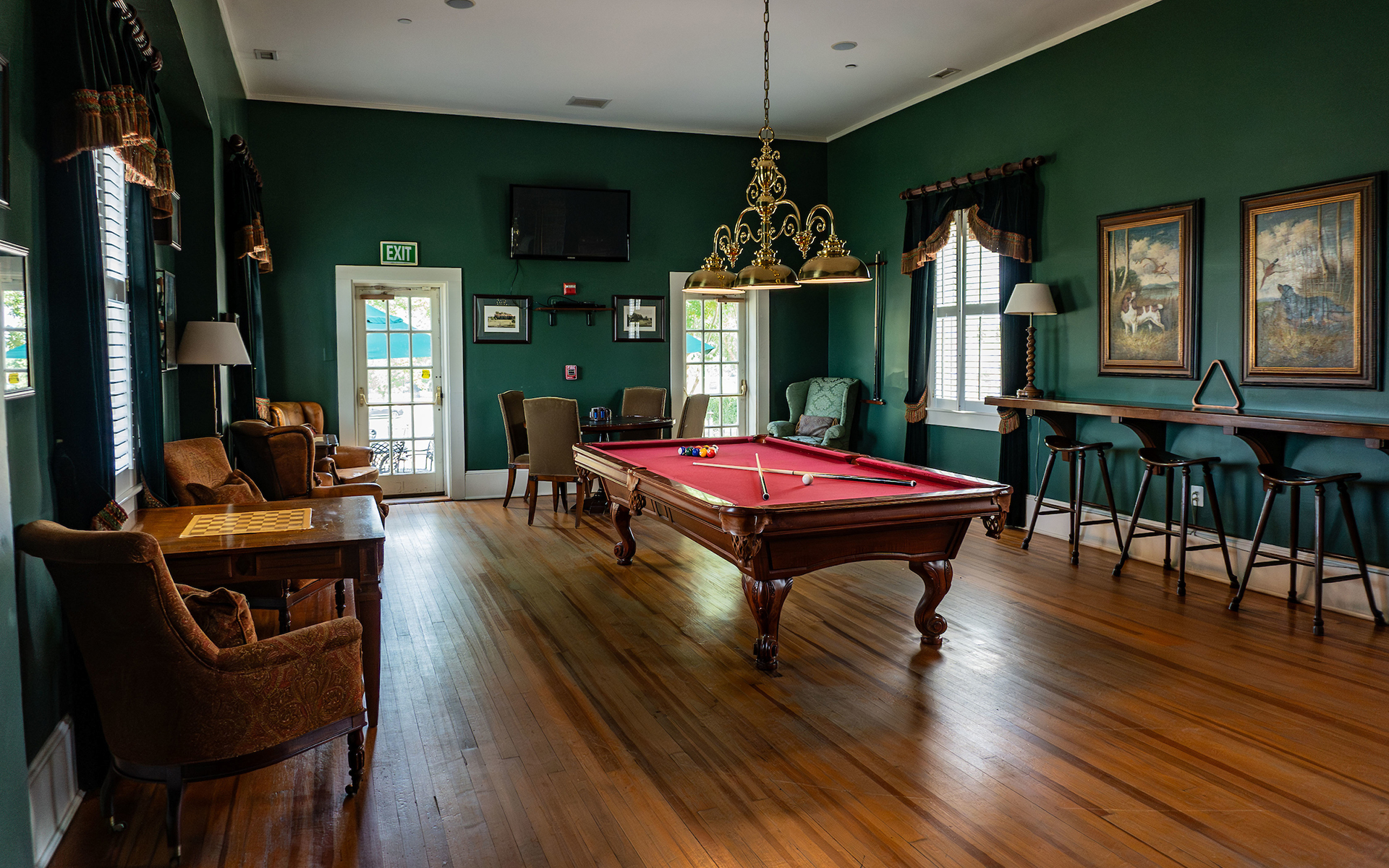 This handsome and masculine room was the original kitchen of the Belmont Manor House. Today, members and guests enjoy a challenging game of billiards, watch their favorite sporting event, or relax on the adjoining outdoor patio with friends.