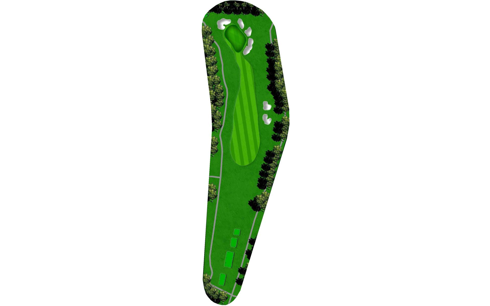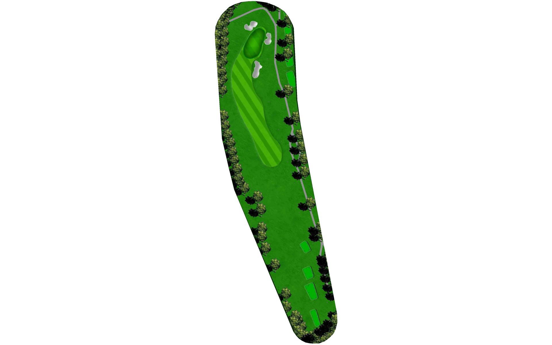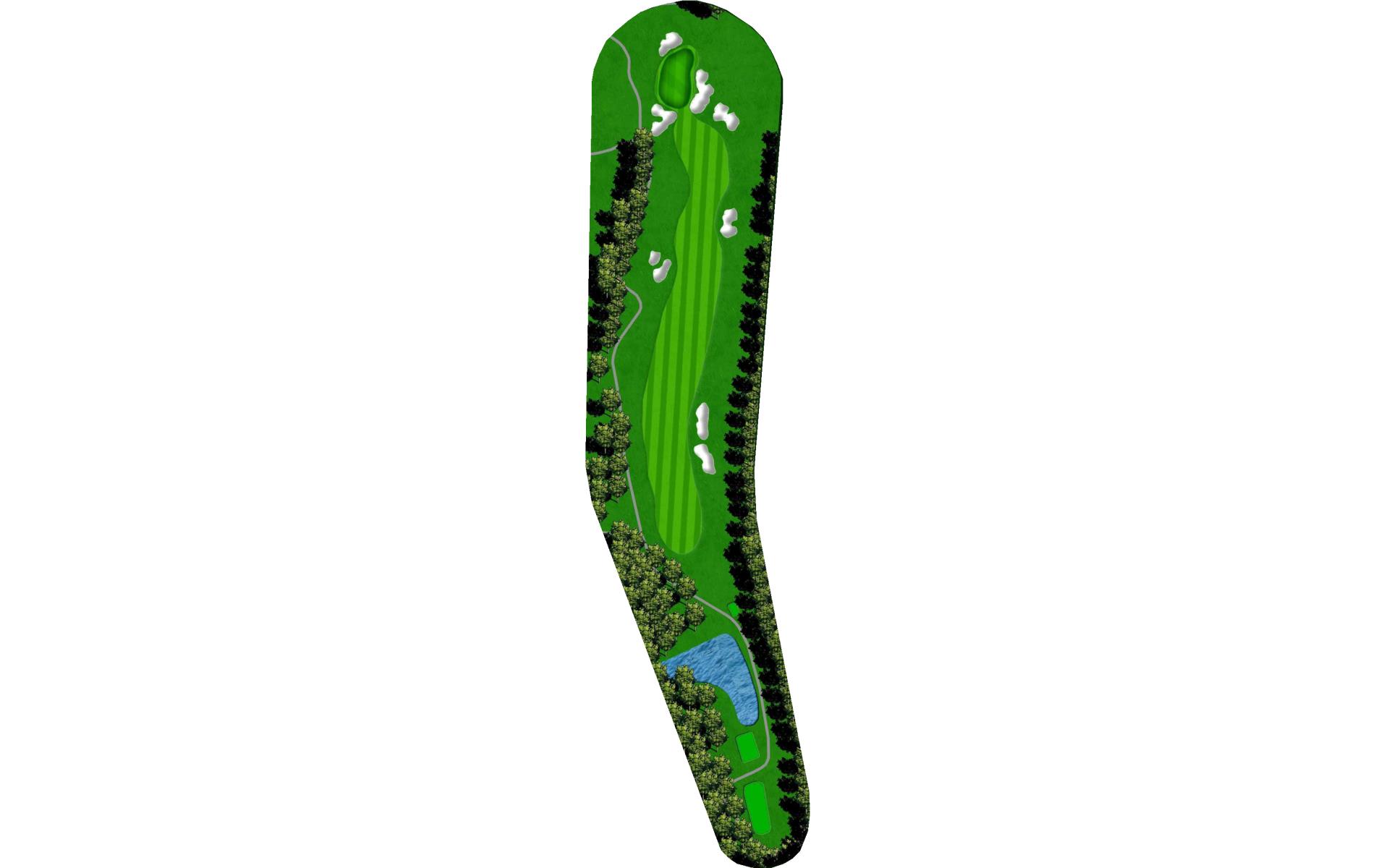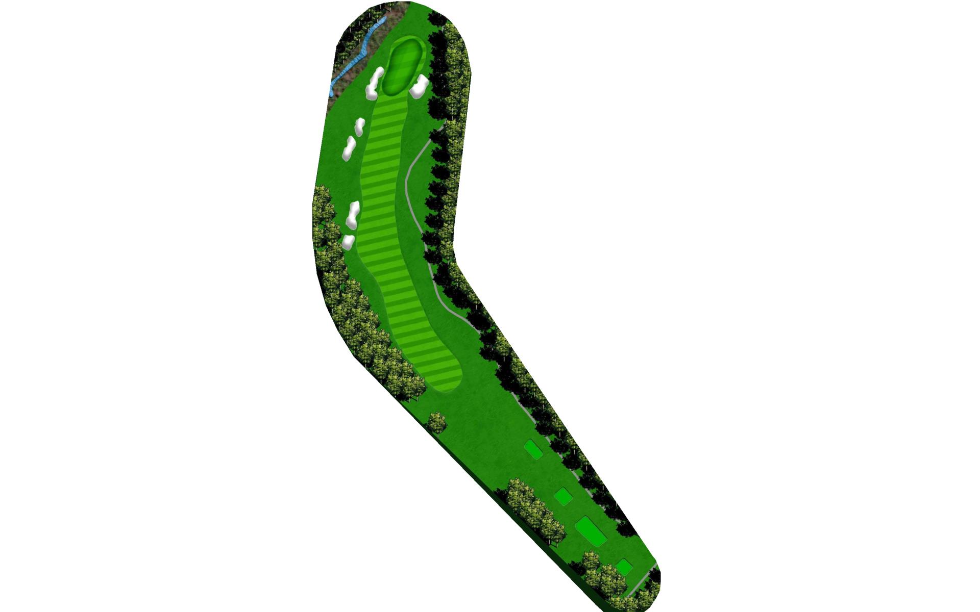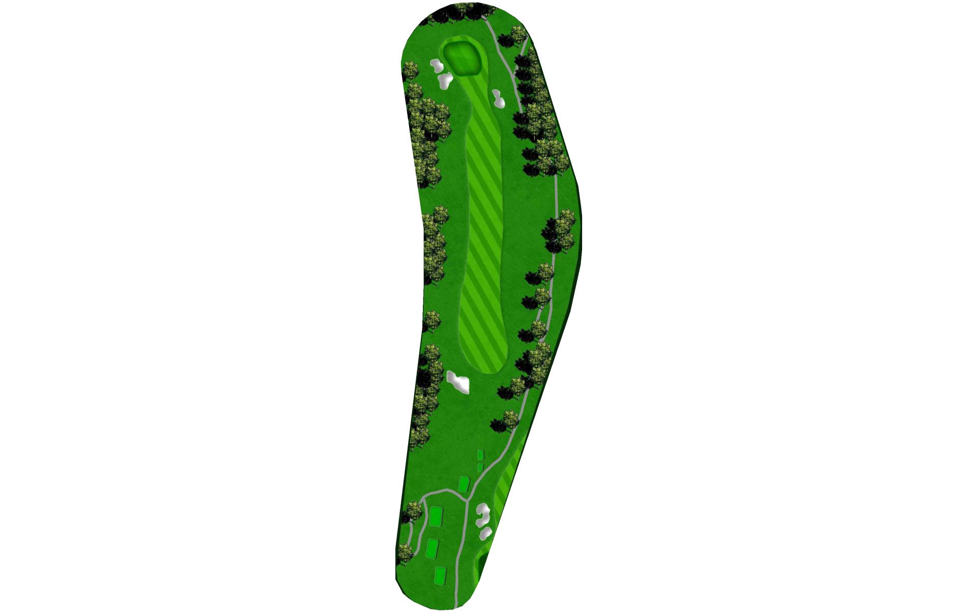 A straight dogleg left with an uphill elevated green that's surrounded by bunkers.