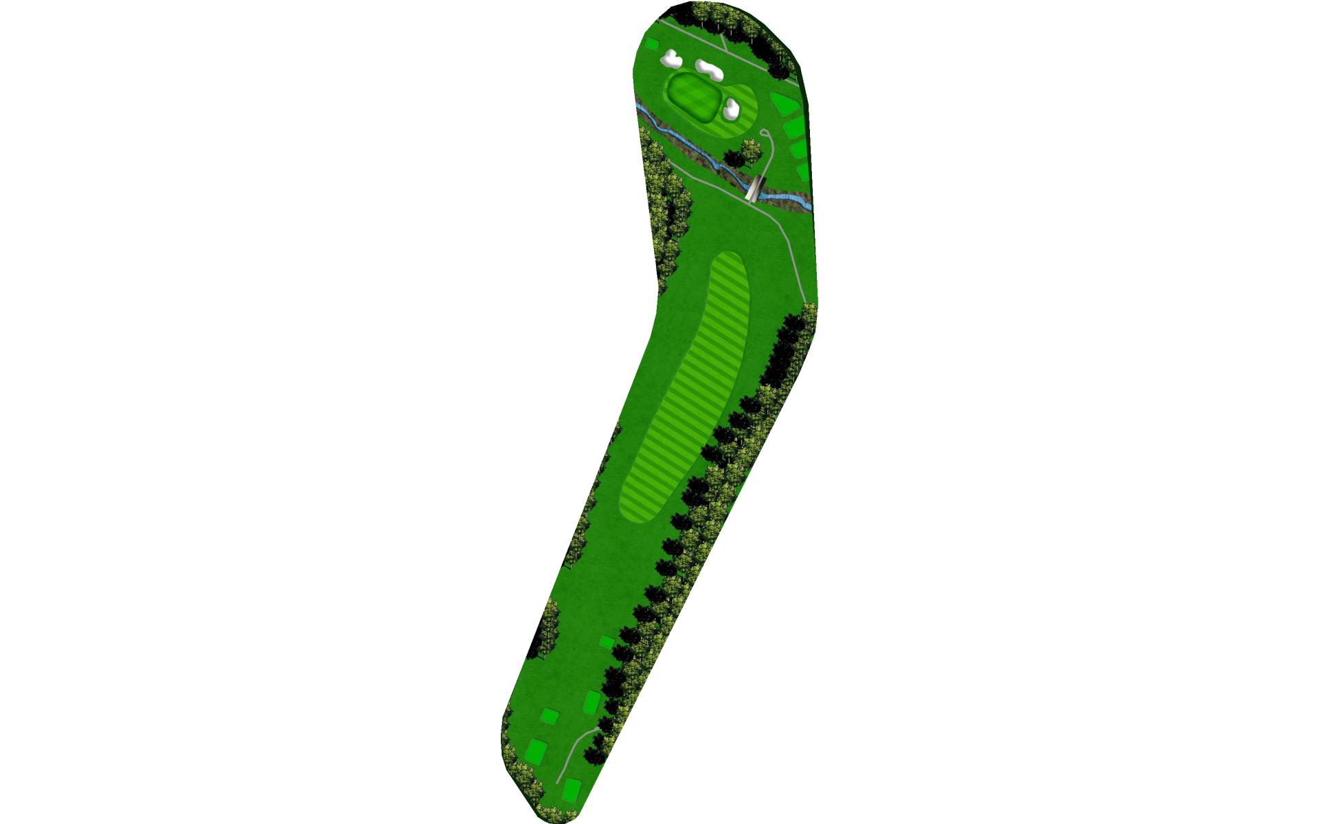 A downhill tee shot, with a second shot that doglegs downhill left to a green with a creek in front.