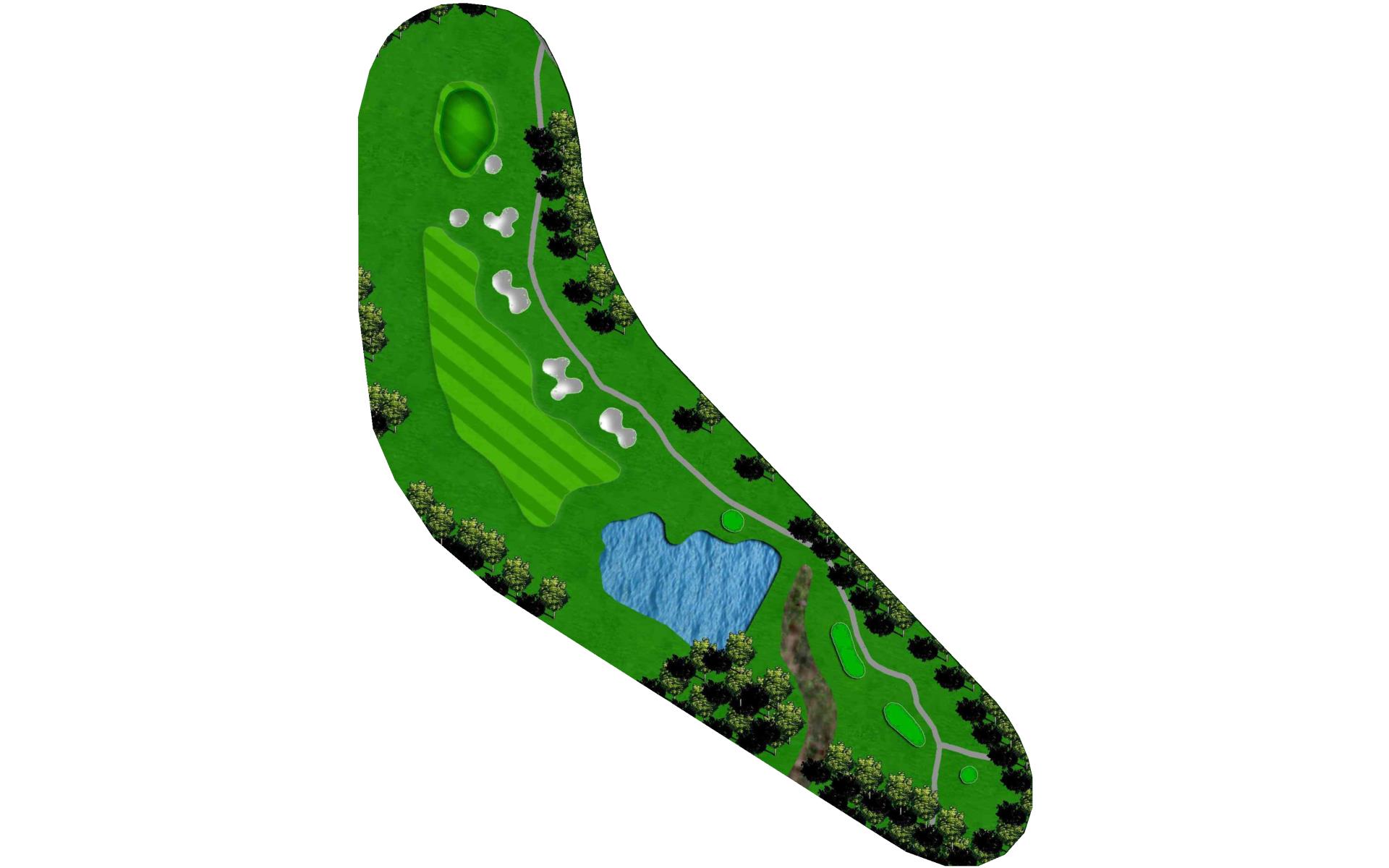This dogleg left par 4 requires a tee shot, from the black tees, of about 200 yards and favoring the right side. The approach shot travels over a green to a green with two bunkers on the left side.