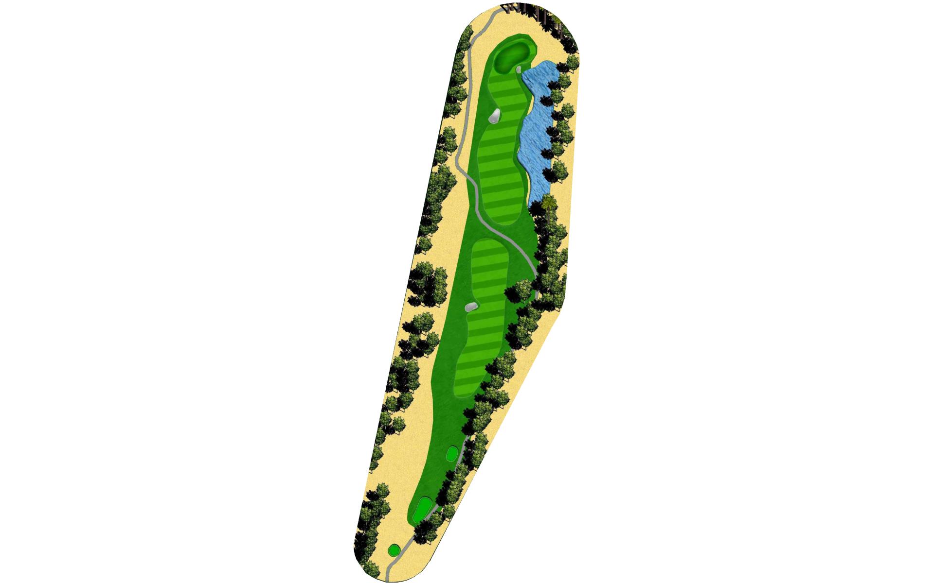 Hardest ranking handicap hole on the course for the men. Par 4 that plays a little down hill off of the tee towards a layup area short of the pond. The pond runs along the entire left side of the green. Any Shots on the left side of the green with too much speed will run off into the pond. The putting green slopes from back to front, and is guarded by a greenside bunker on the right.  *Player Note: Aim for the trees/bush lines through the fairway as your target point off of the tee.
