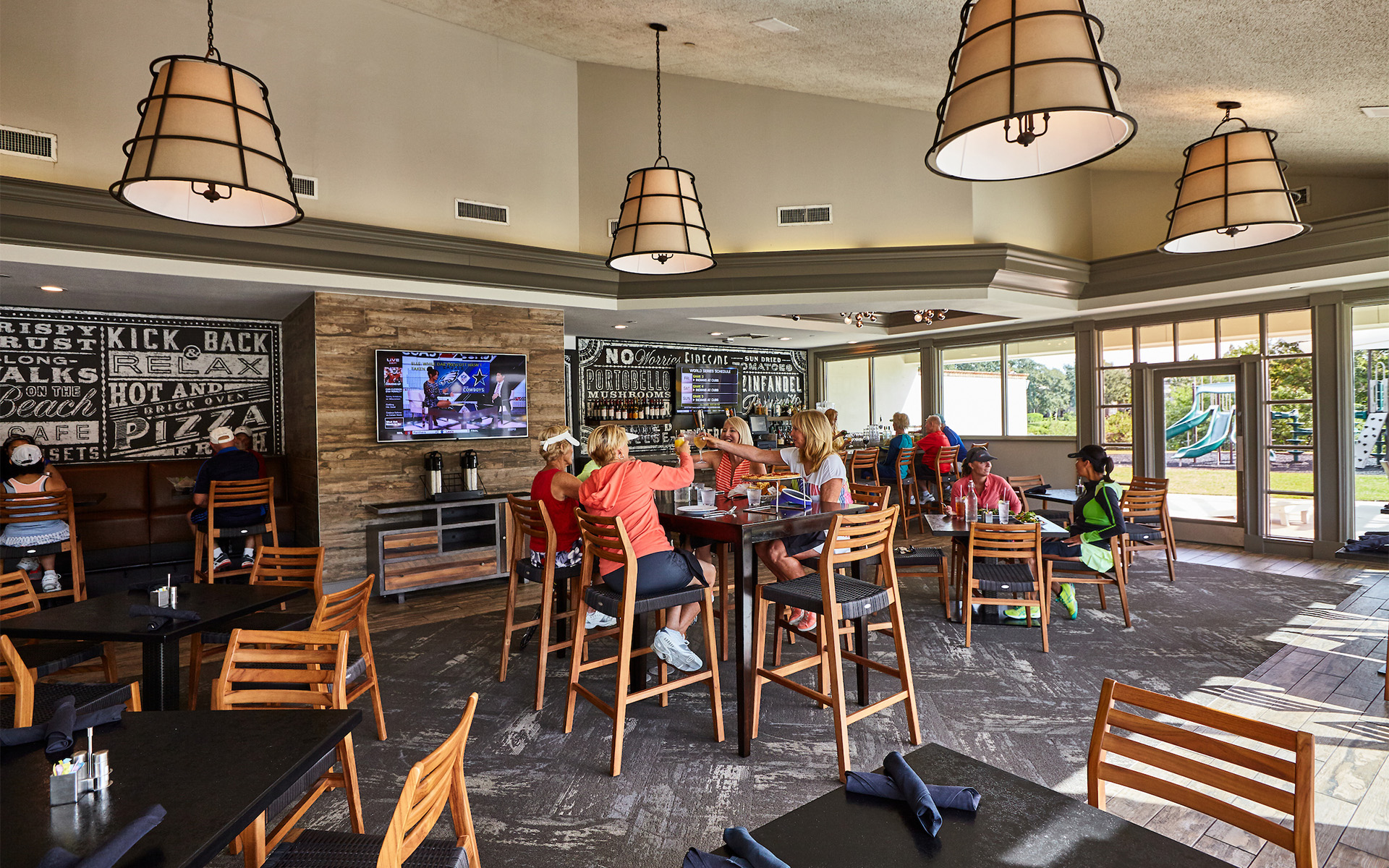 The Fireside Café overlooking the sparkling pool and lake offers indoor as well as outdoor dining in a casual, family atmosphere. The menu features a variety of creative appetizers, healthy salads, a salad bar, hearty sandwiches, snacks and a full bar.
