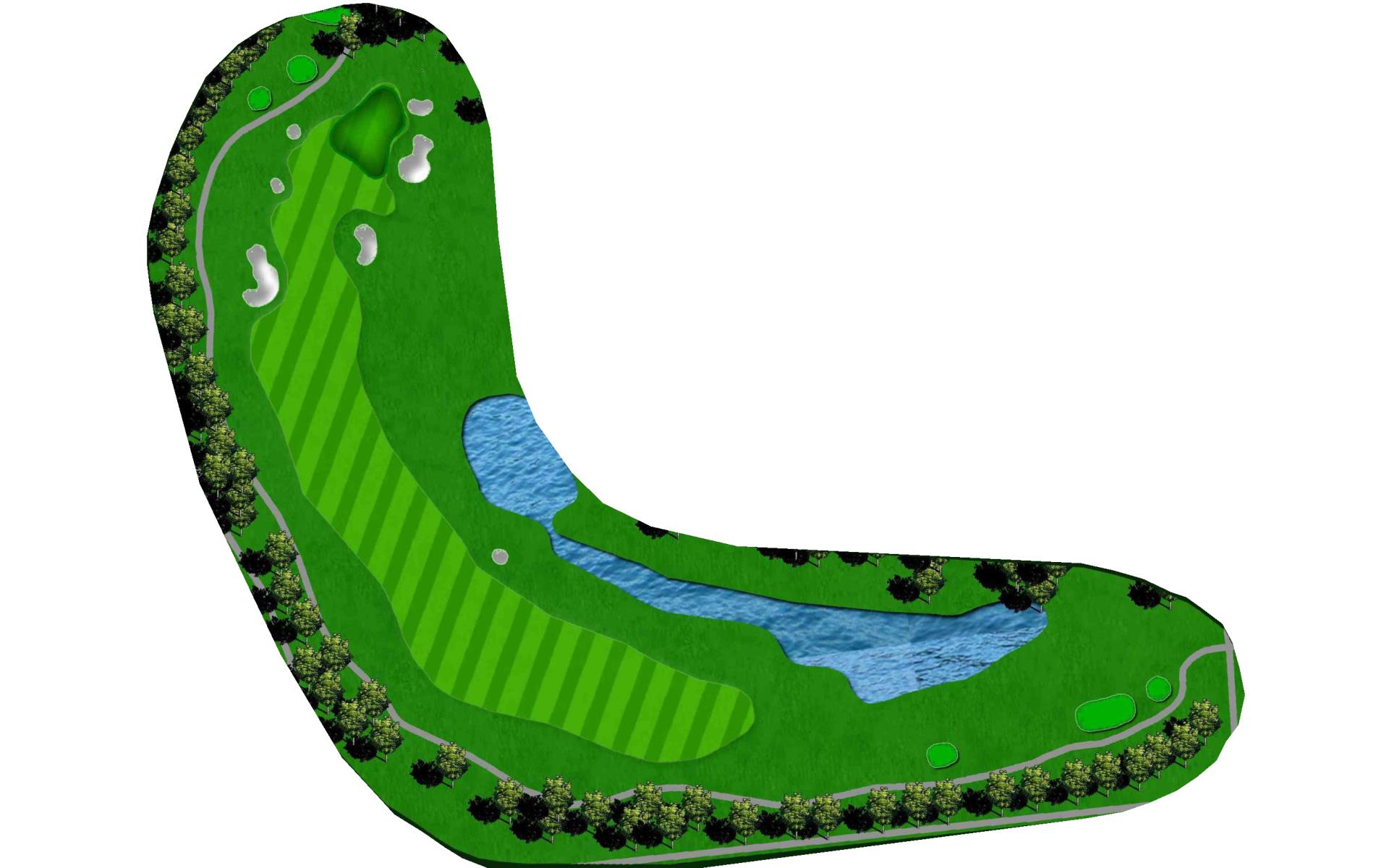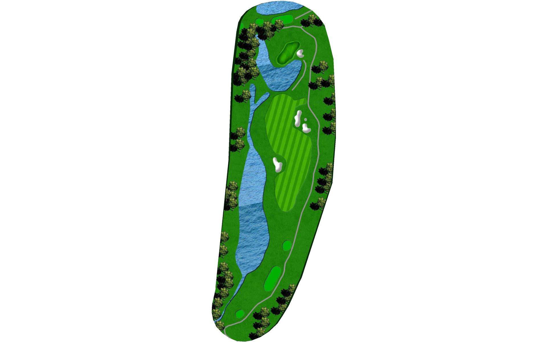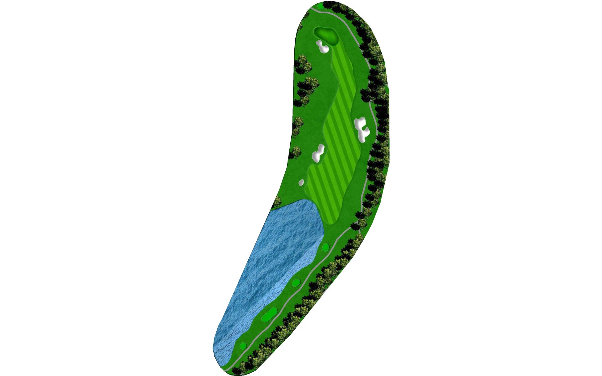 This long dogleg left par 4 requires players to carry the water on their drive to a landing area flanked by fairway bunkers. The approach shot must avoid the large greenside bunker on the left.