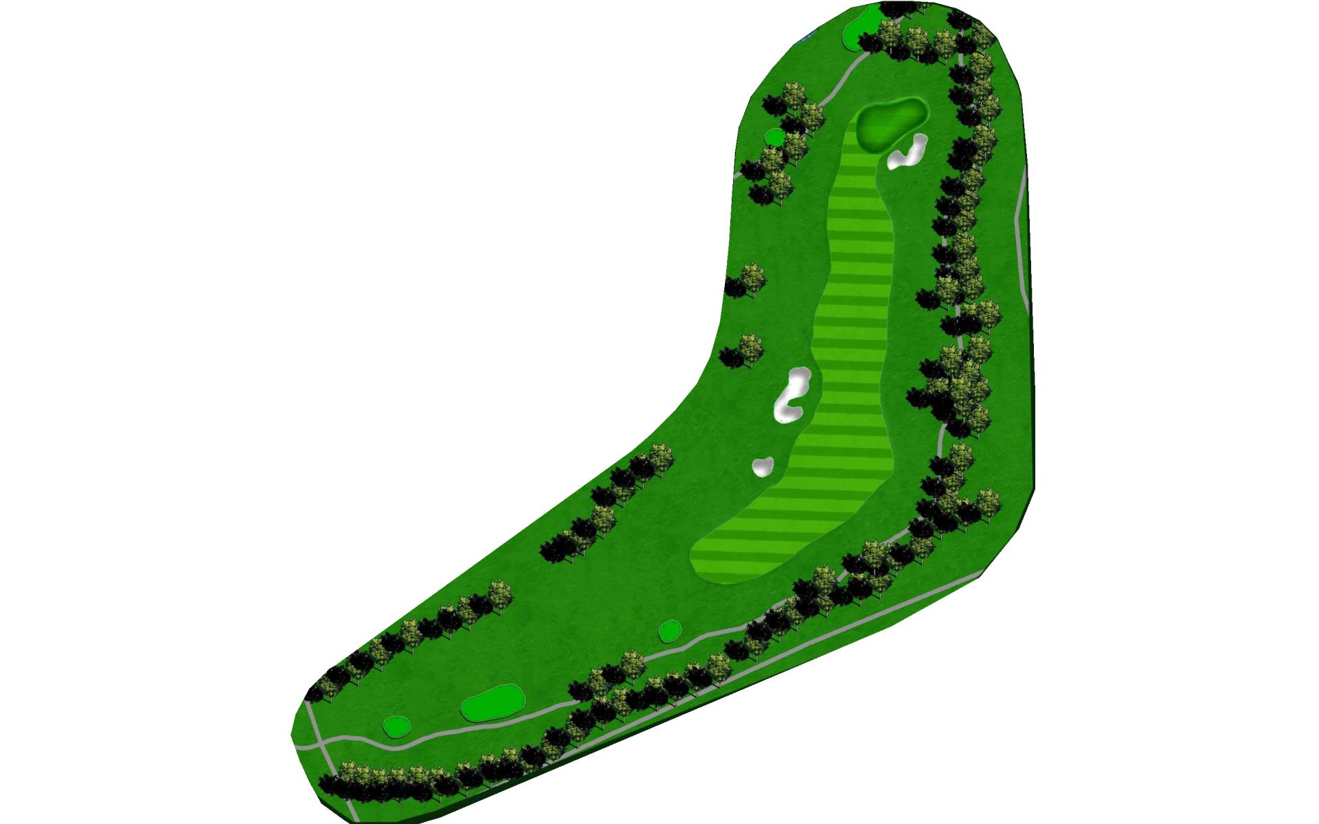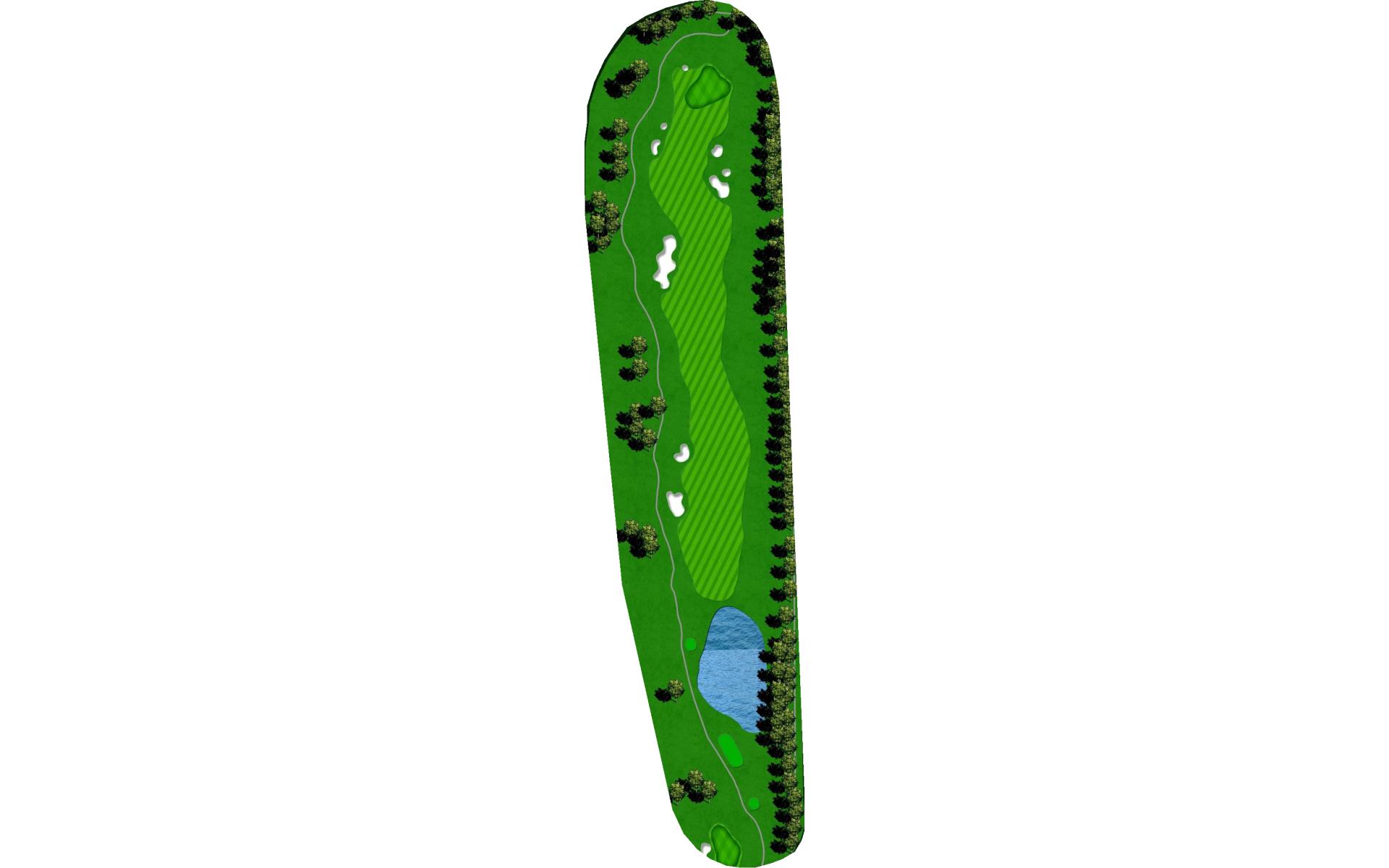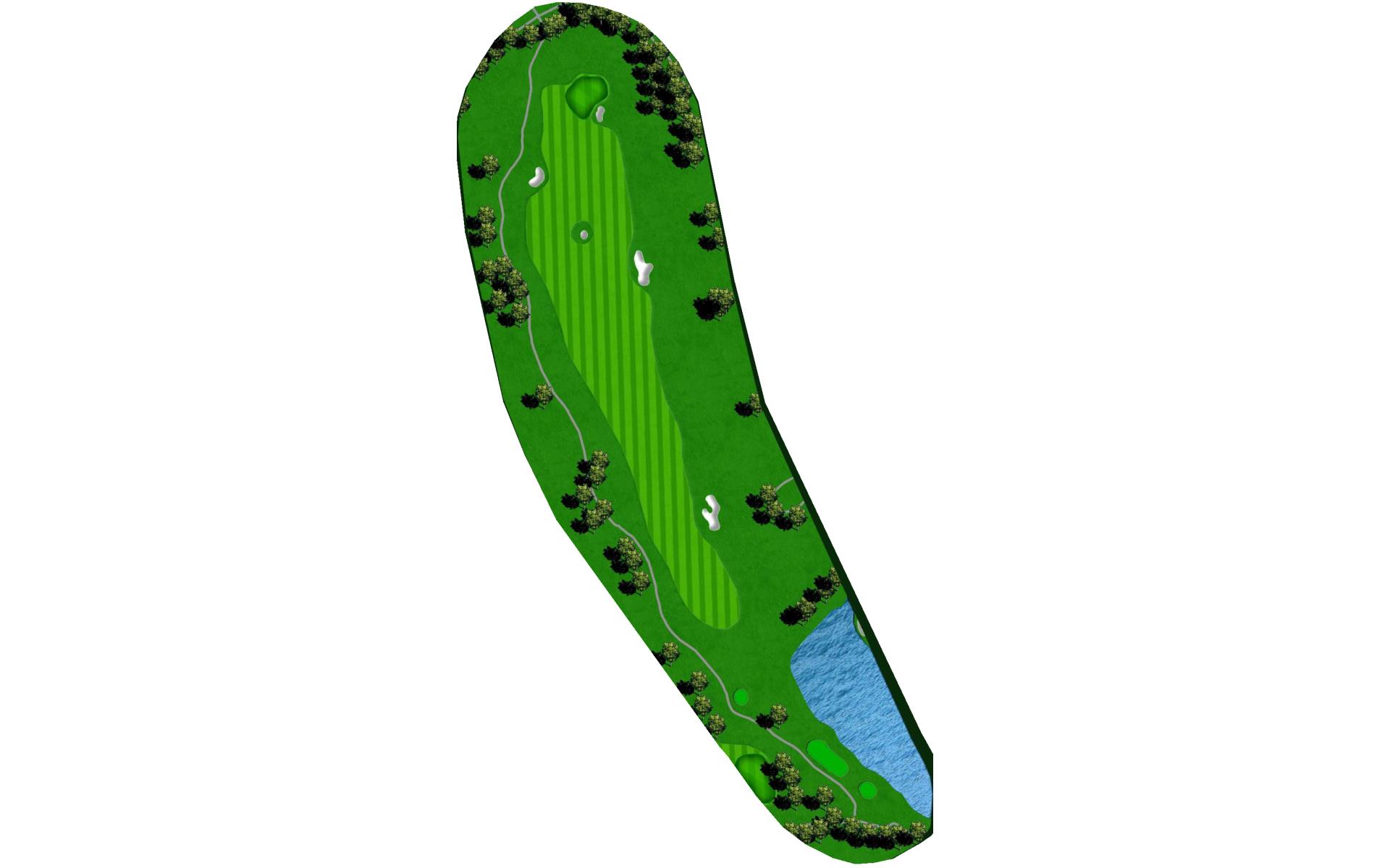 This long dogleg left par 4 requires players to carry the water on their drive to a landing area flanked by fairway bunkers. The approach shot must avoid the large greenside bunker on the left.
