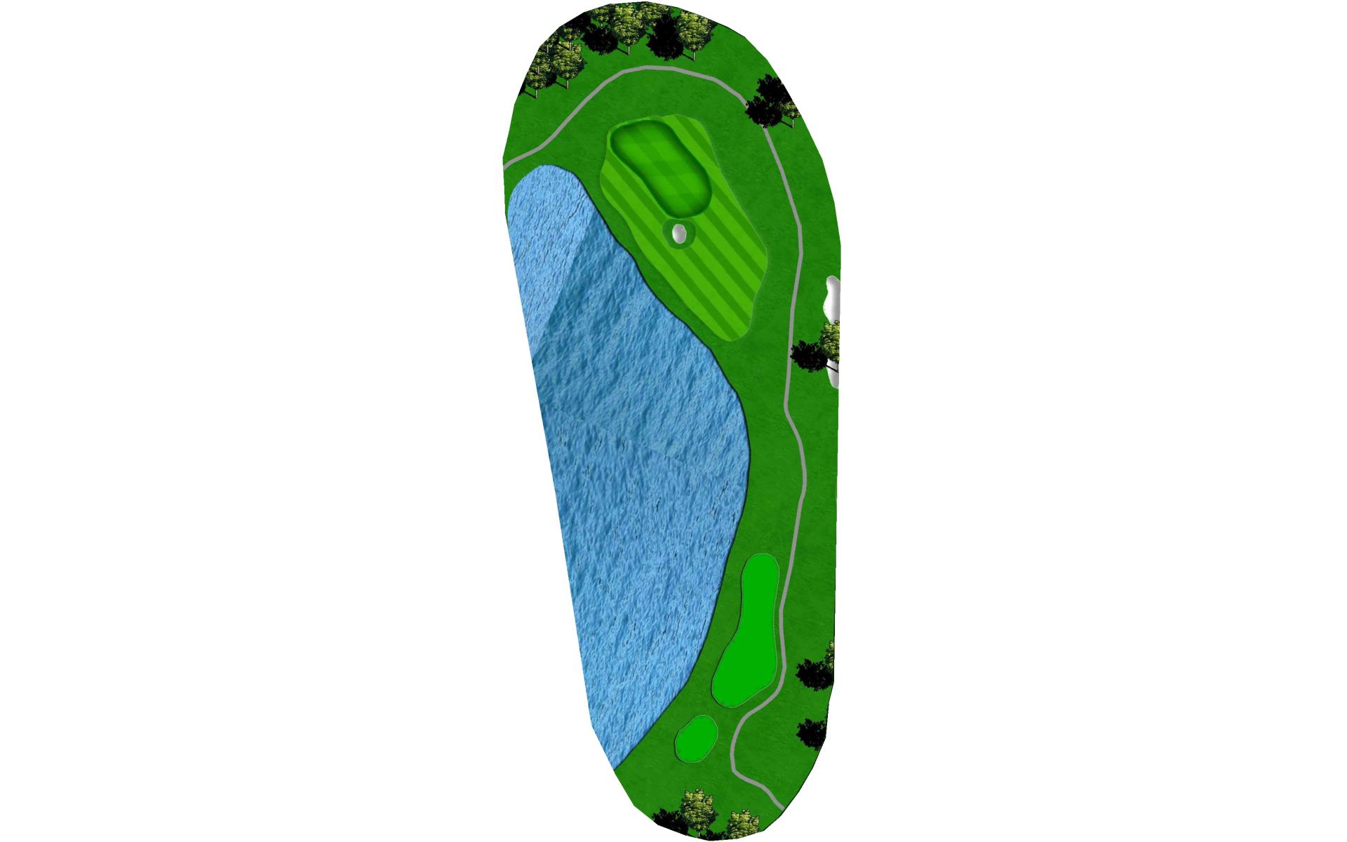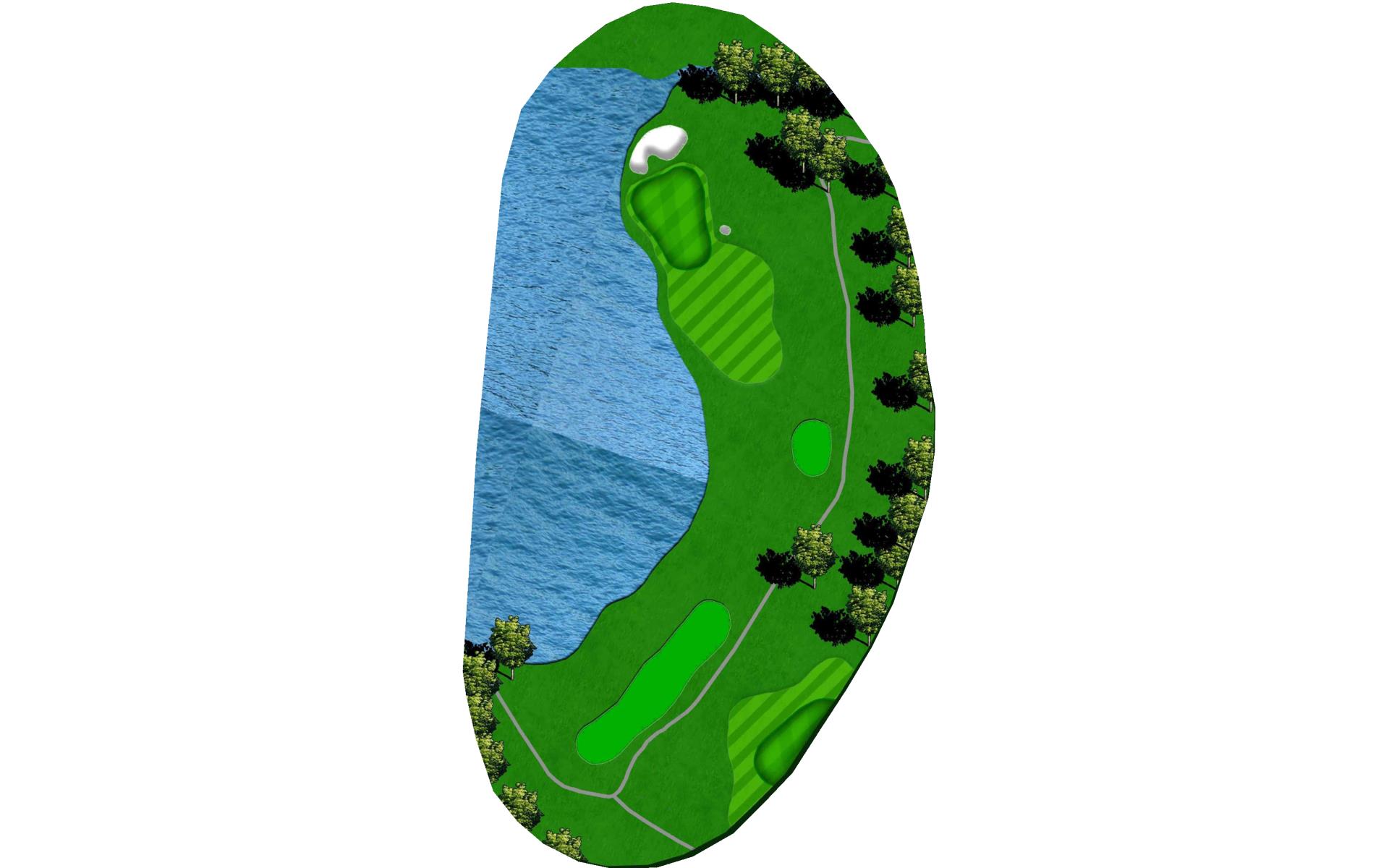 The green on this strong par 3 features three-tiers and is protected in front by water and a small pot bunker on the front-right edge. A swale at the center of the green will feed balls down to a lower fairway next to the water.