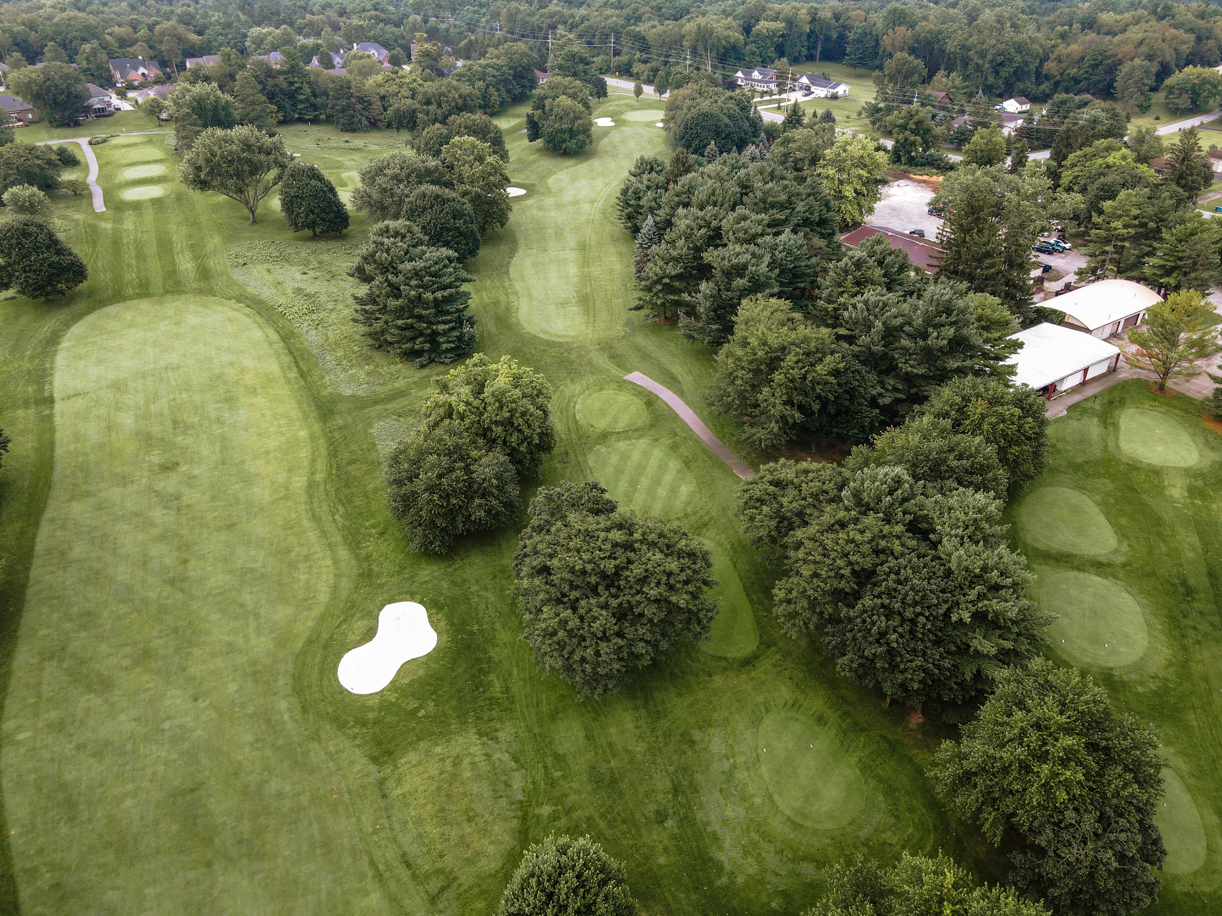 You finish the Champ Course with a very playable Par 4. Tee shot needs to avoid the OB that goes the full length of the right side of the fairway and trees that line the left side. The green is protected by sand traps front left, front right and back right. Mounding around the green can also produce some challenging up and downs.
