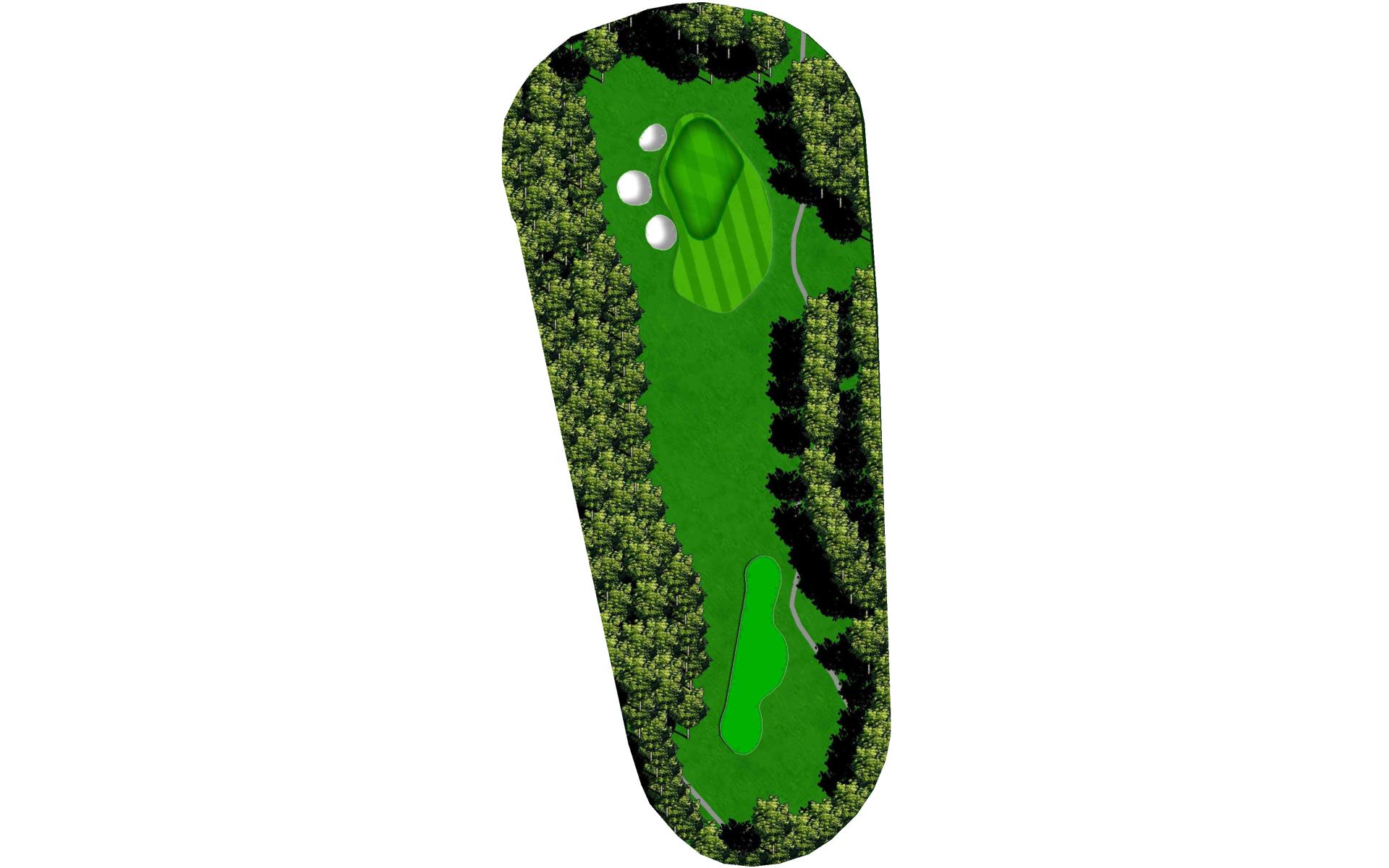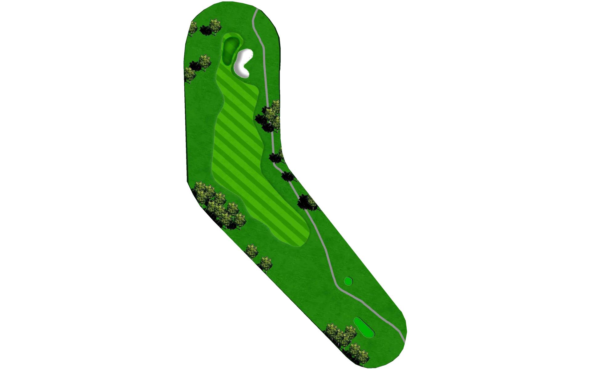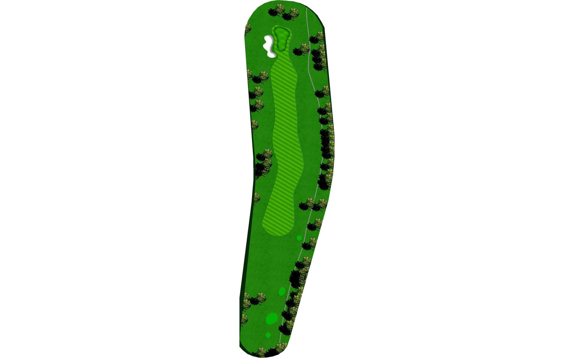 This slight dog leg left requires a precise tee shot that favors the right side of the fairway as the left is protected by trees and a Creek. Most players will have a long Iron in and need to favor the Center Left porton of the green to stay away from the Bunker and Water right of the green. This green as a decent amount of undulation in it so being in the correct section is vital.