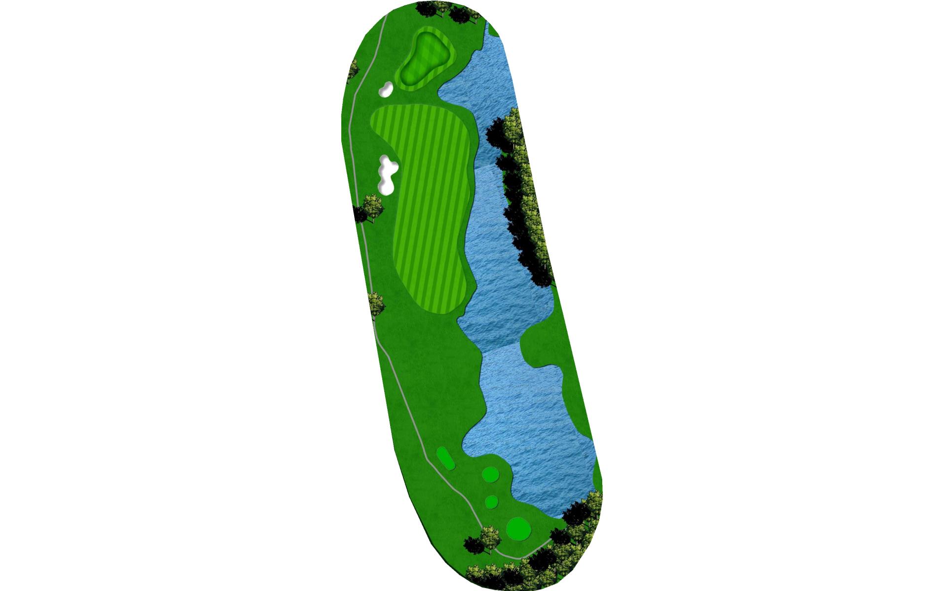 This long Par Three has a Hazard protecting the right side of the green and there is a Bail out area short left of the green. This tricky green has many different slopes in it so being below the hole is optimal.