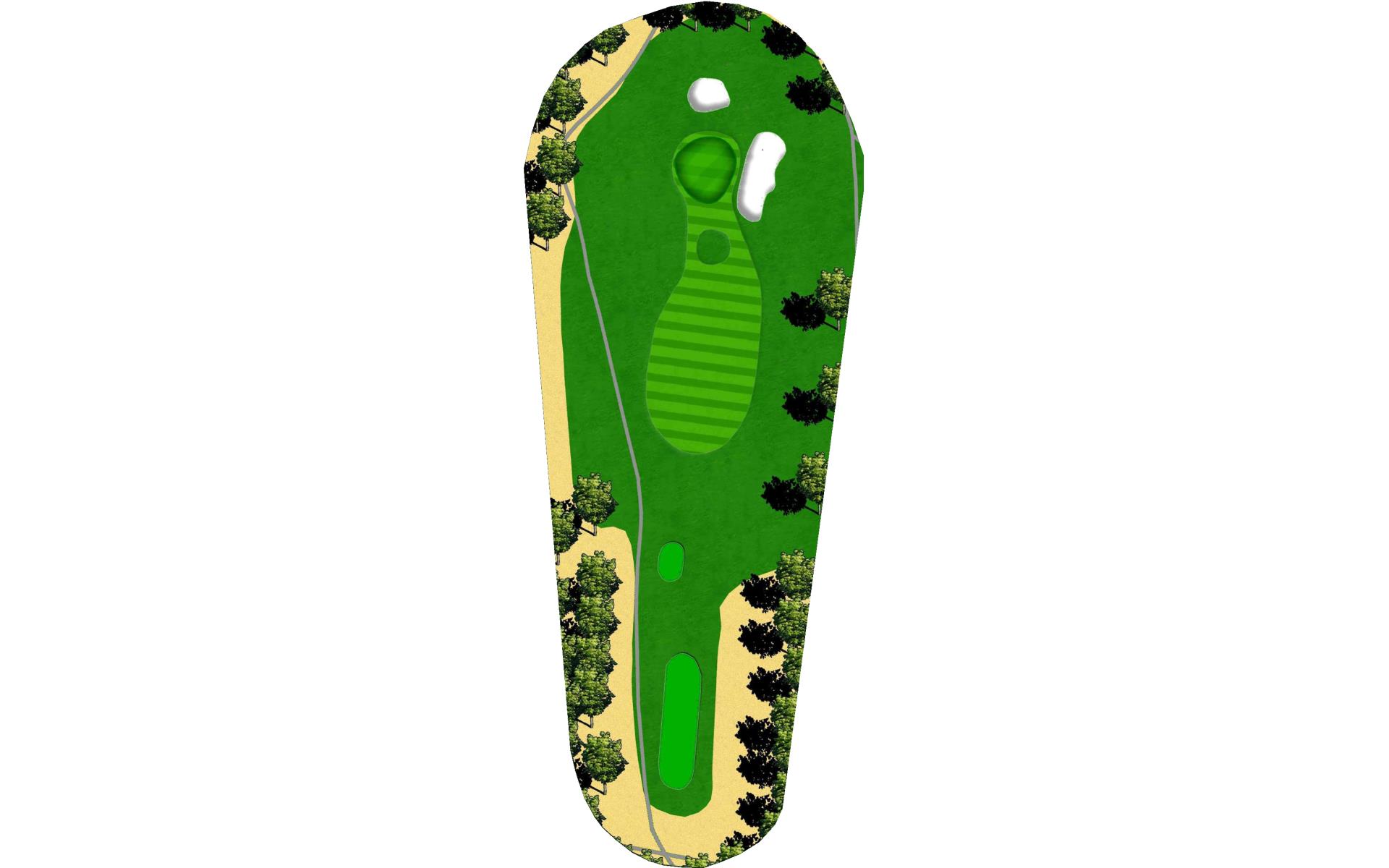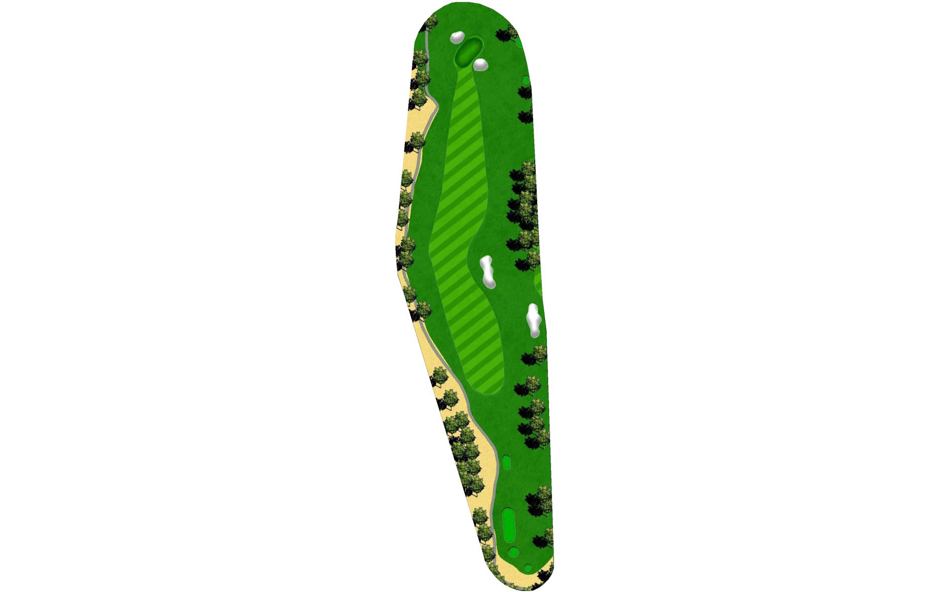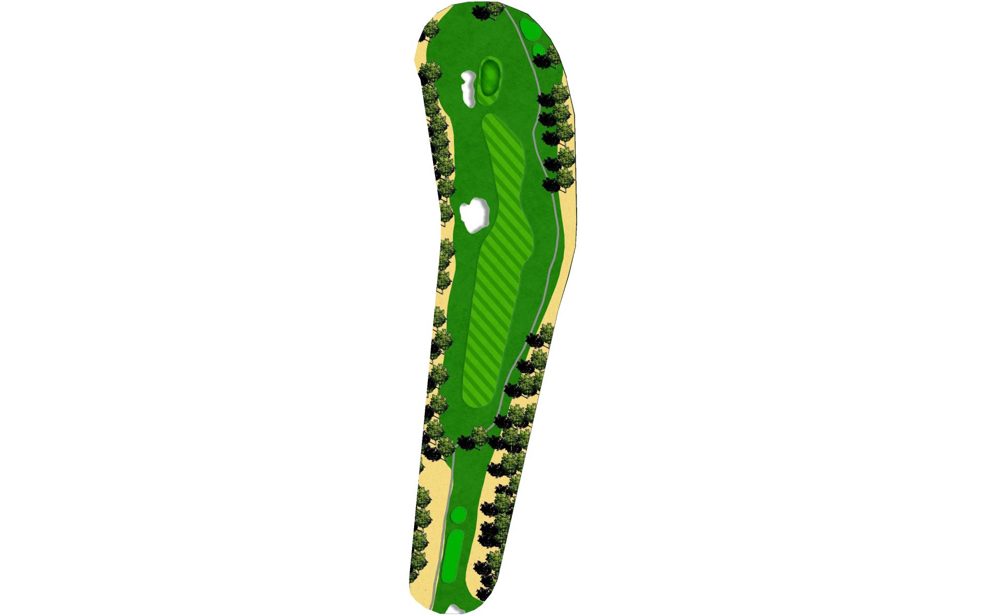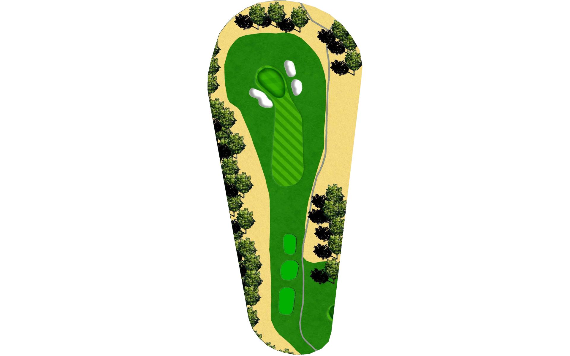 A slight dogleg right forces you to either try for distance plus accuracy to get very close to this green, or lay back to a more open area short of the grove of trees which will allow a full shot with a short iron to the steep green. Beware the out-of-bounds left and right.