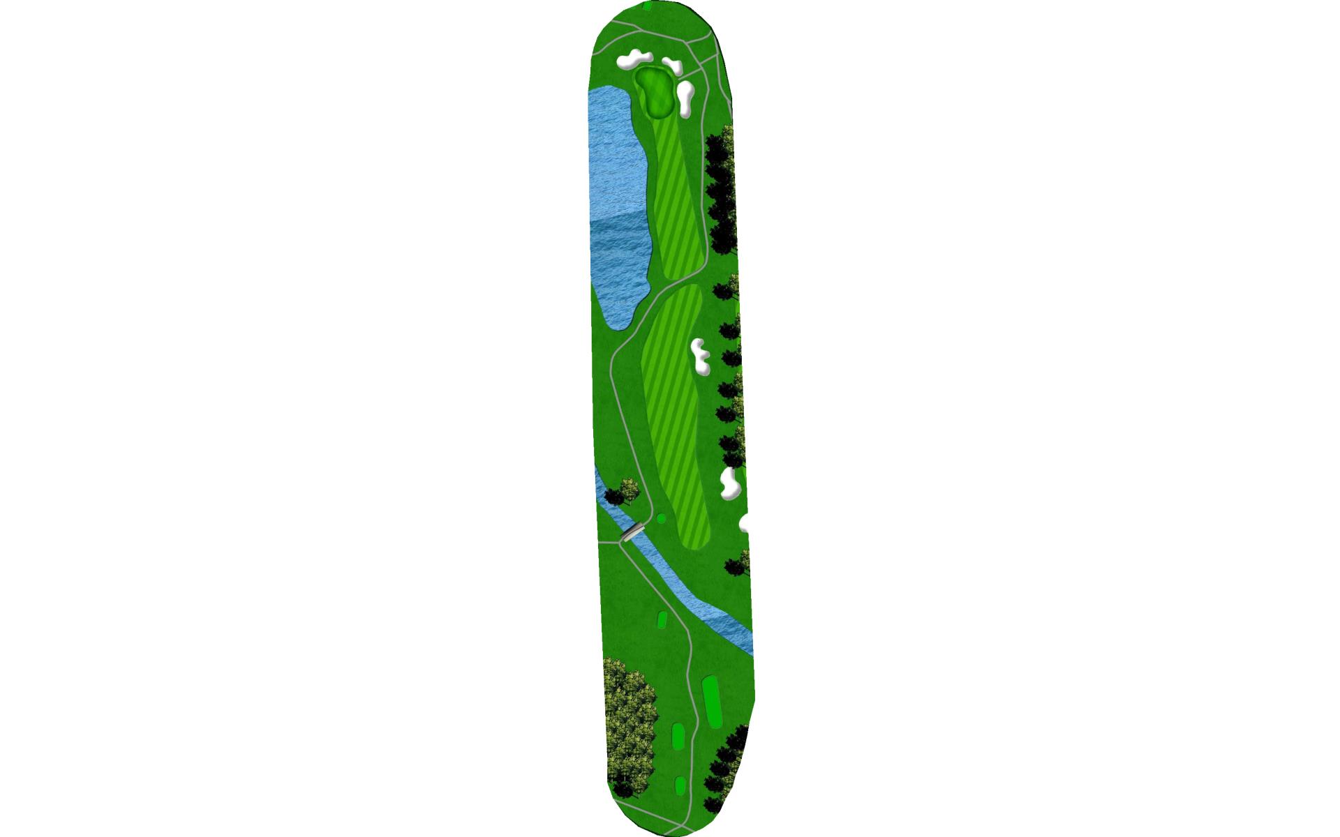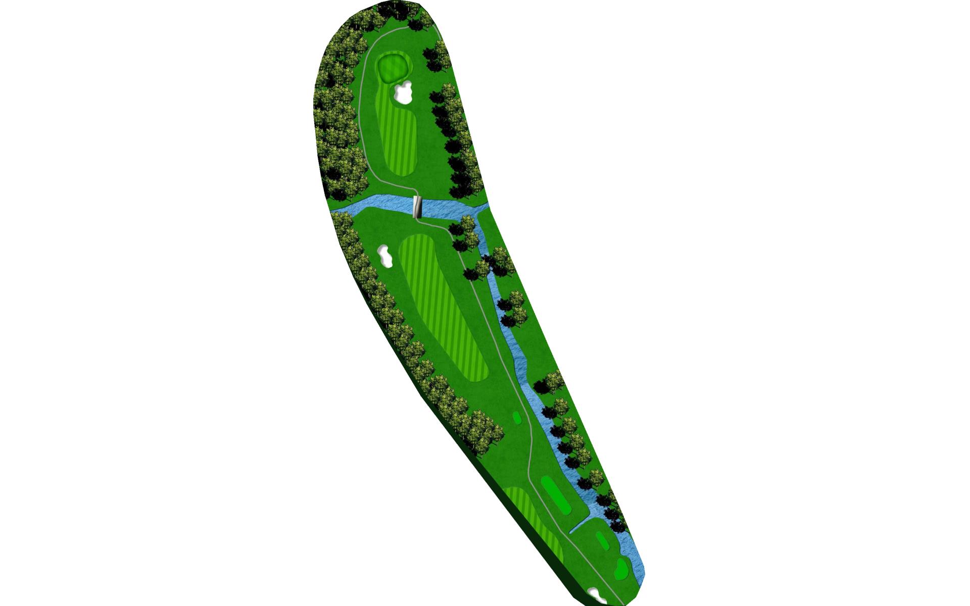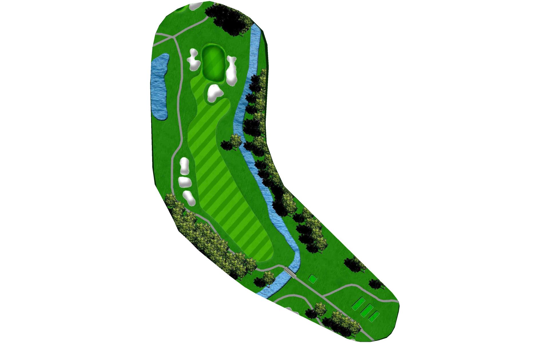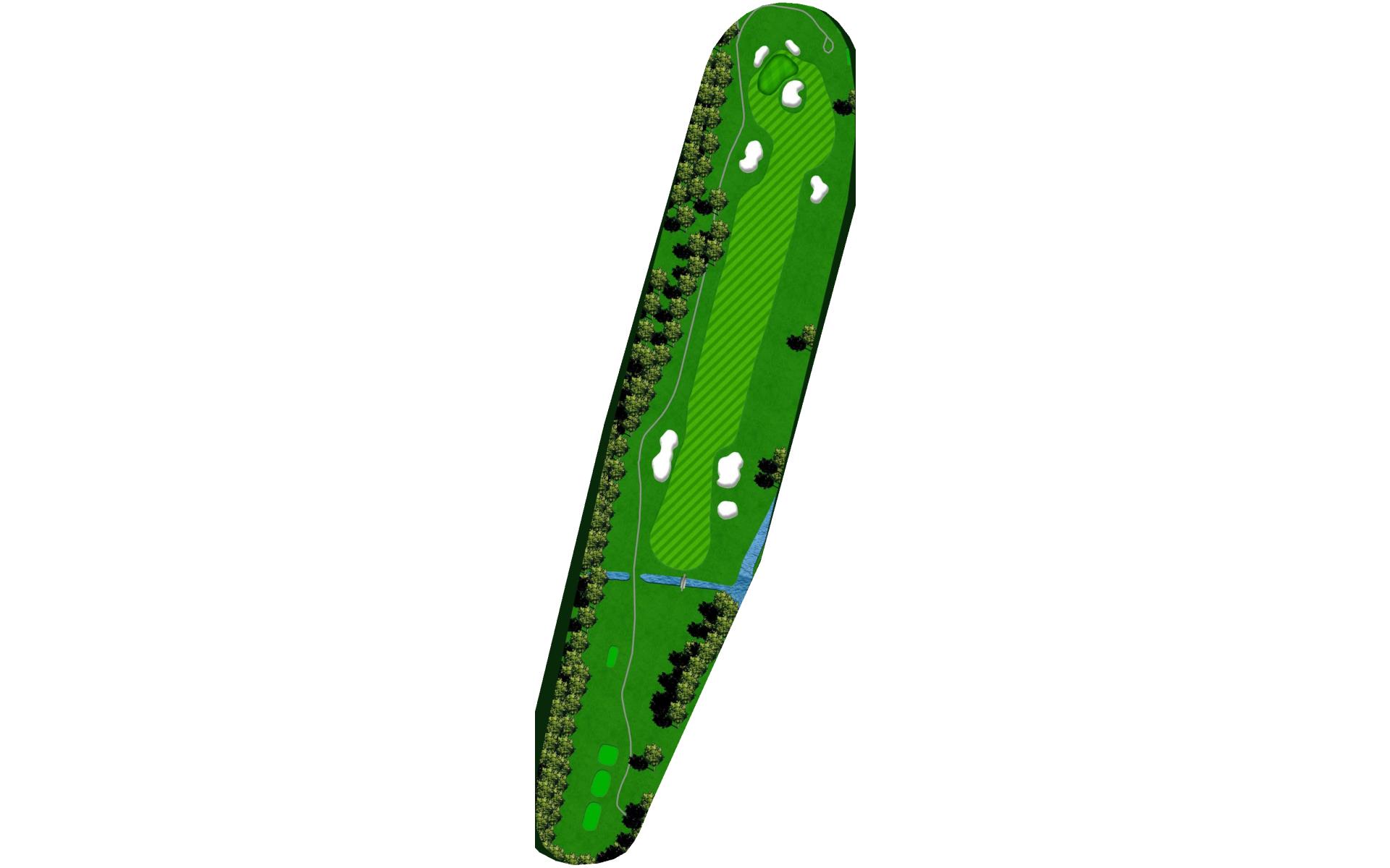 Sharp right dog leg after bridge, so keep your tee shot in play. Avoid the water on your right side near the bridge. Miss the green short for an easy up and down.