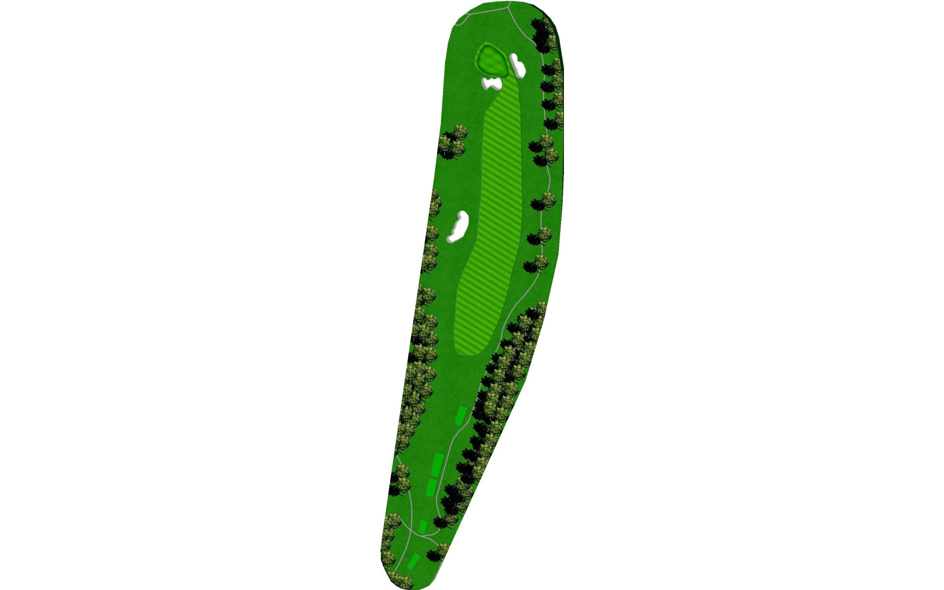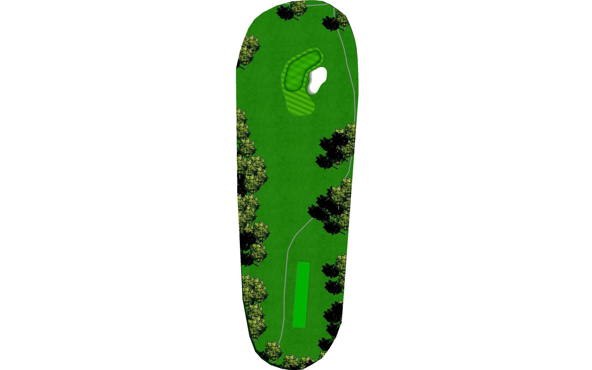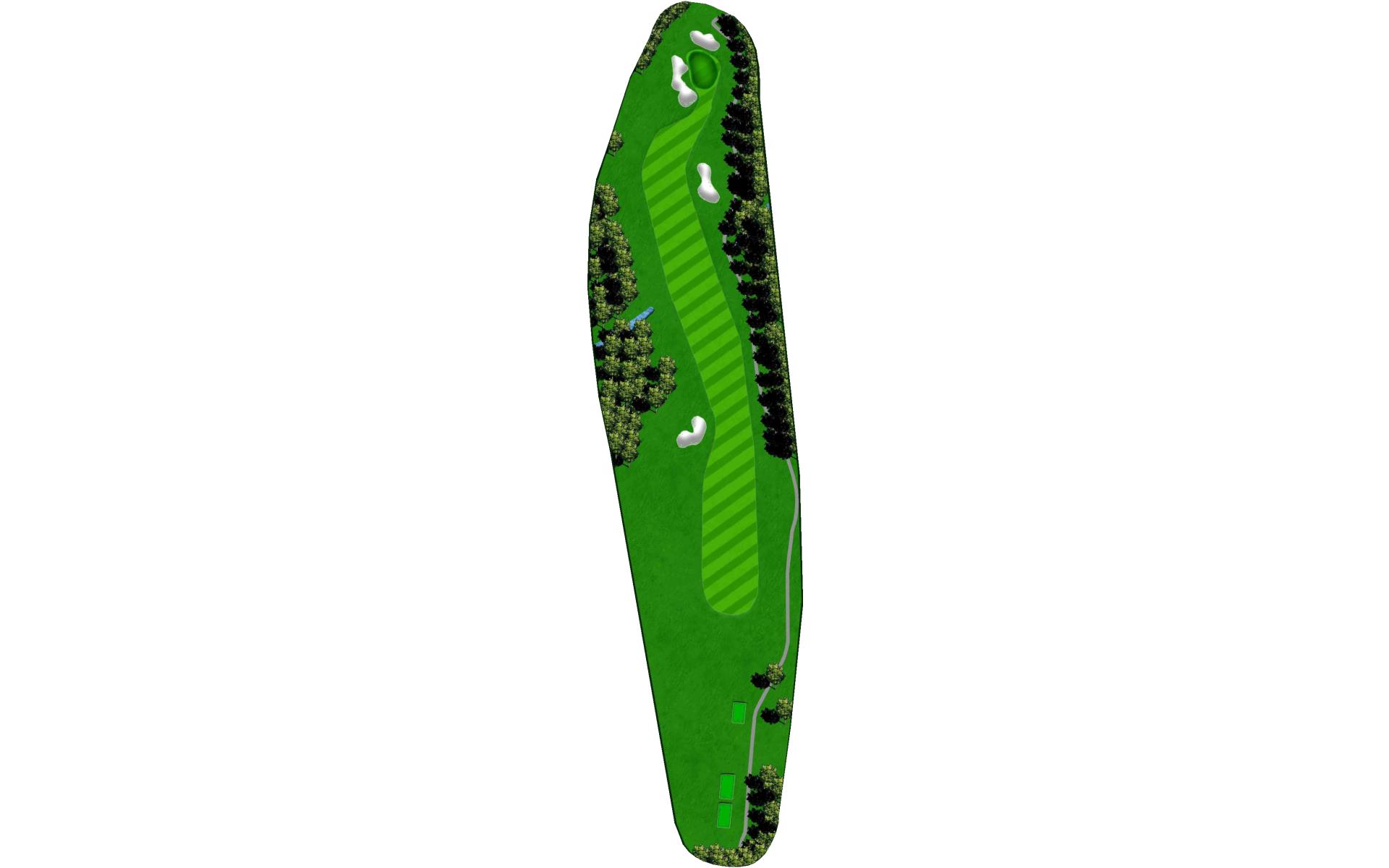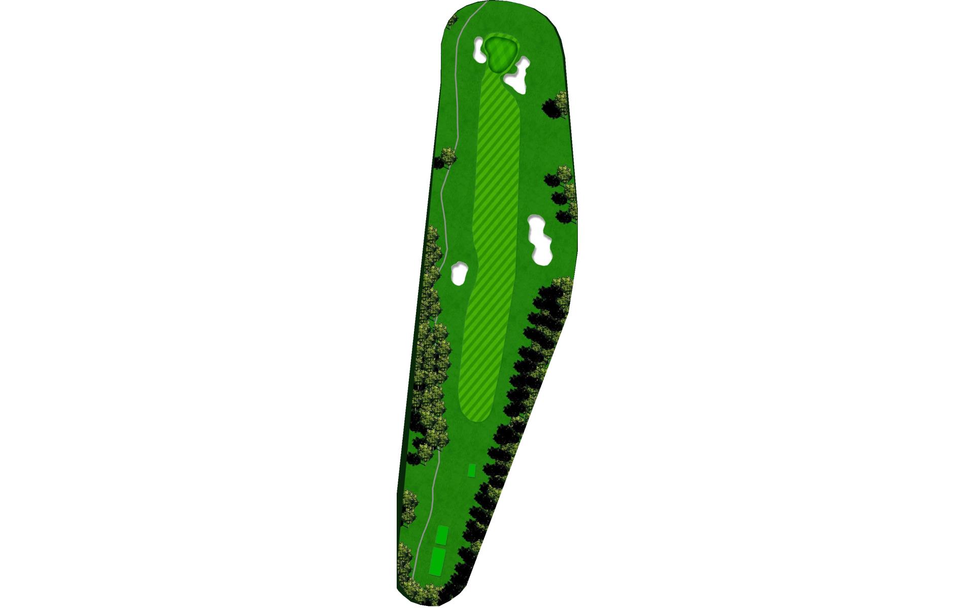 A good drive here could seem tempting to go for it, but this green is surrounded by an army of Hogan’s bunkers that won’t let you in. Lay up to the right of the trees for the best angle to the pin.