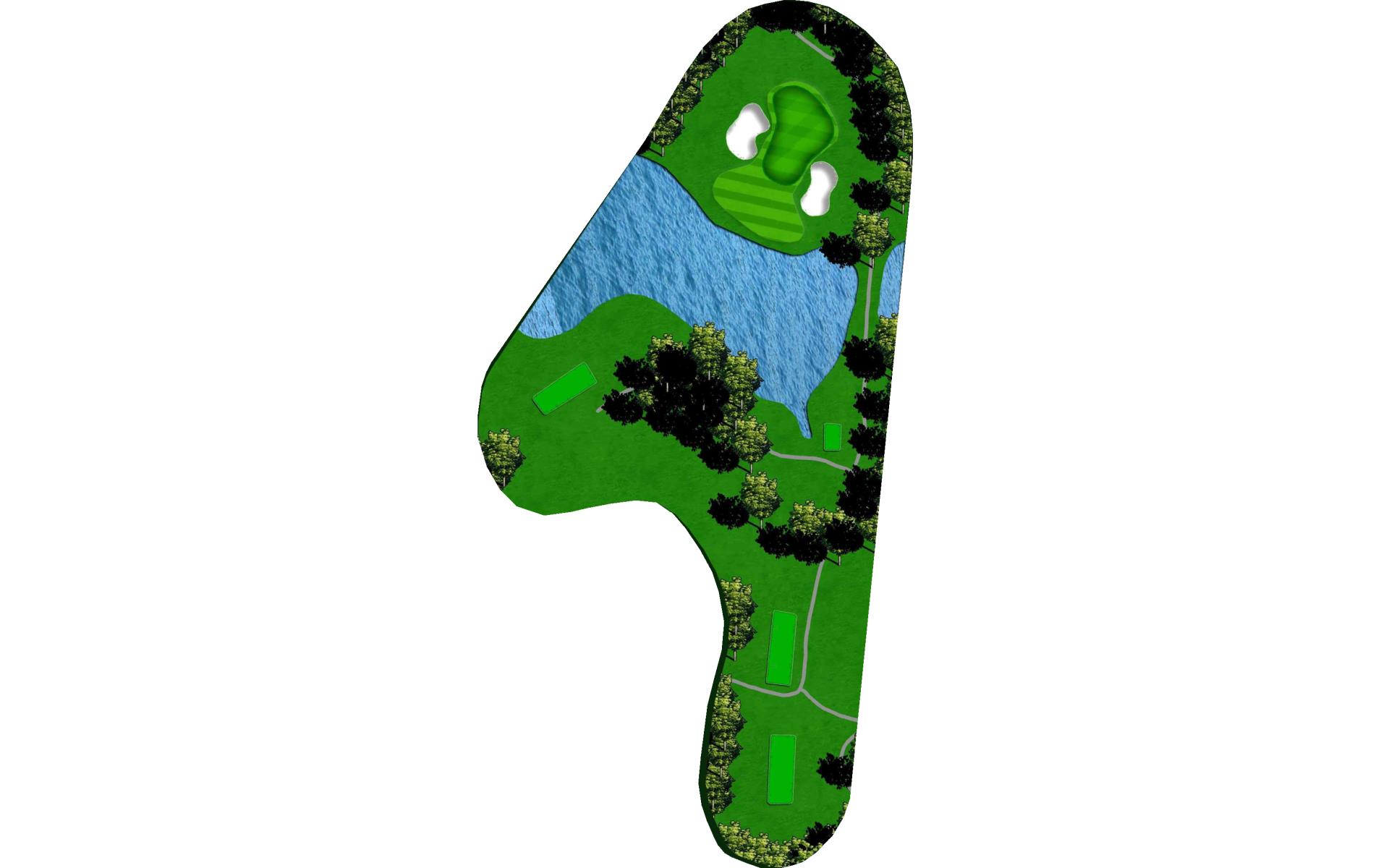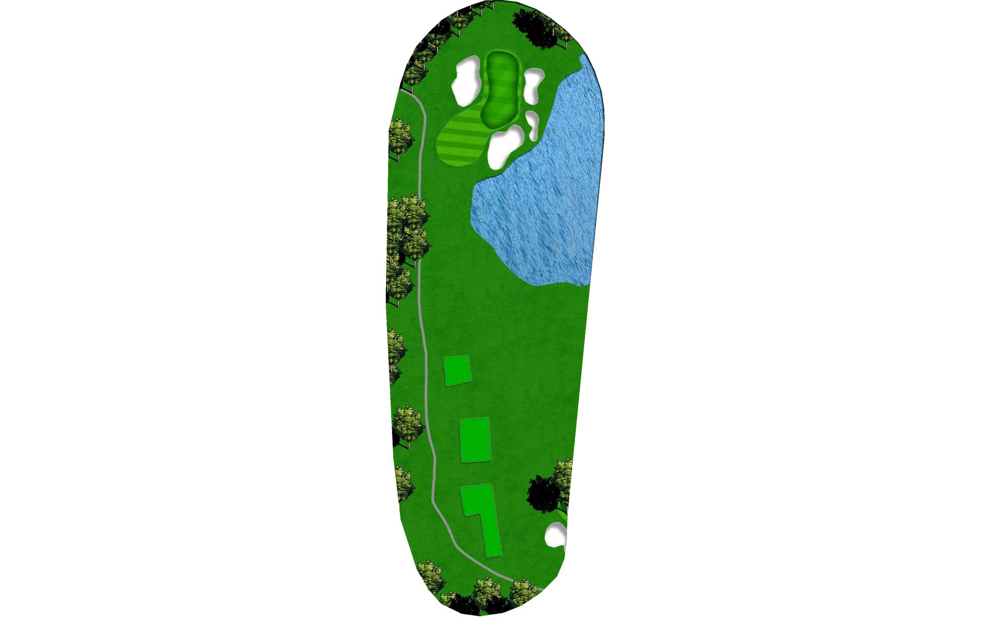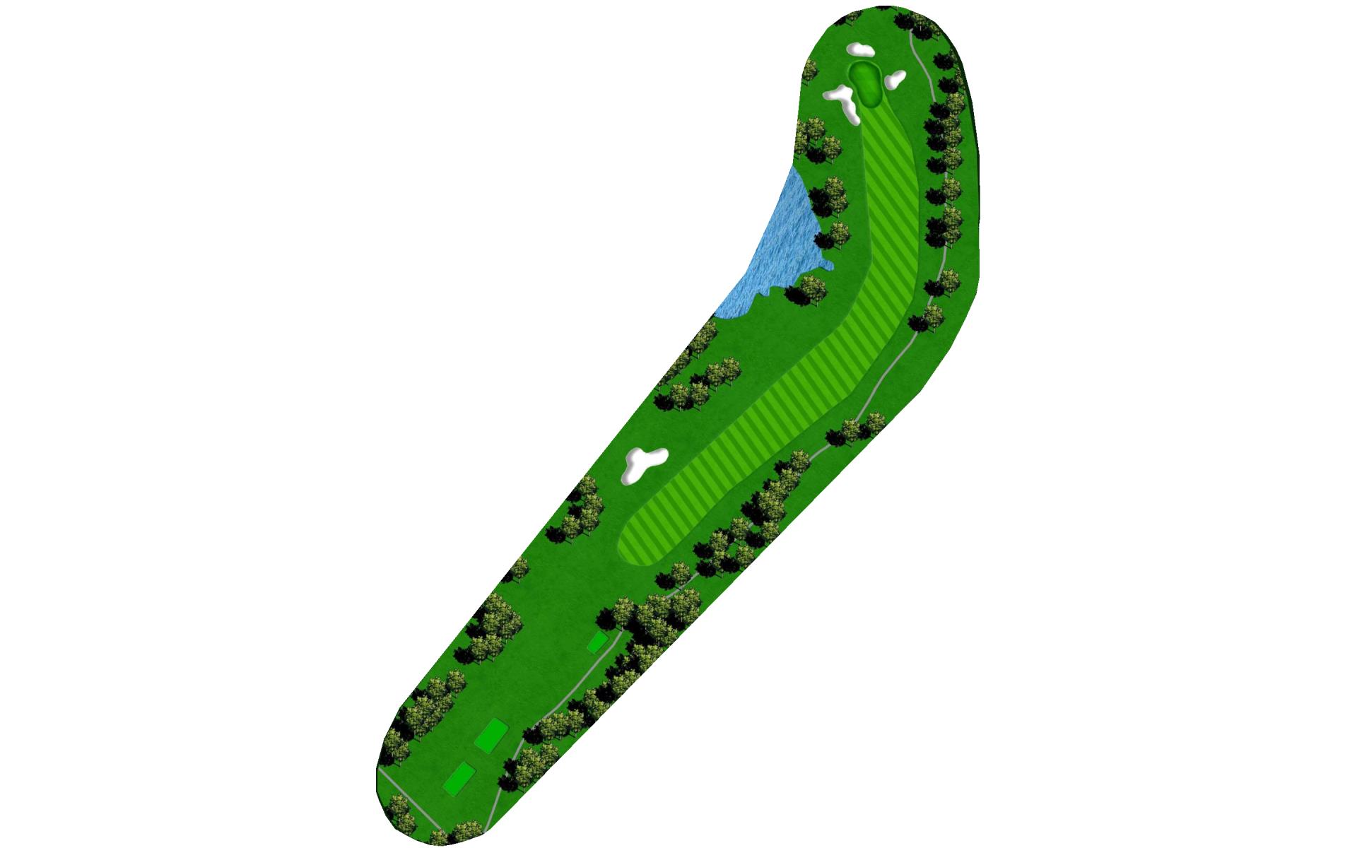This par 3 is surrounded by bunkers and pond on the right. The safety play is short and left of the green. Long left or right will make for very difficult up and down.