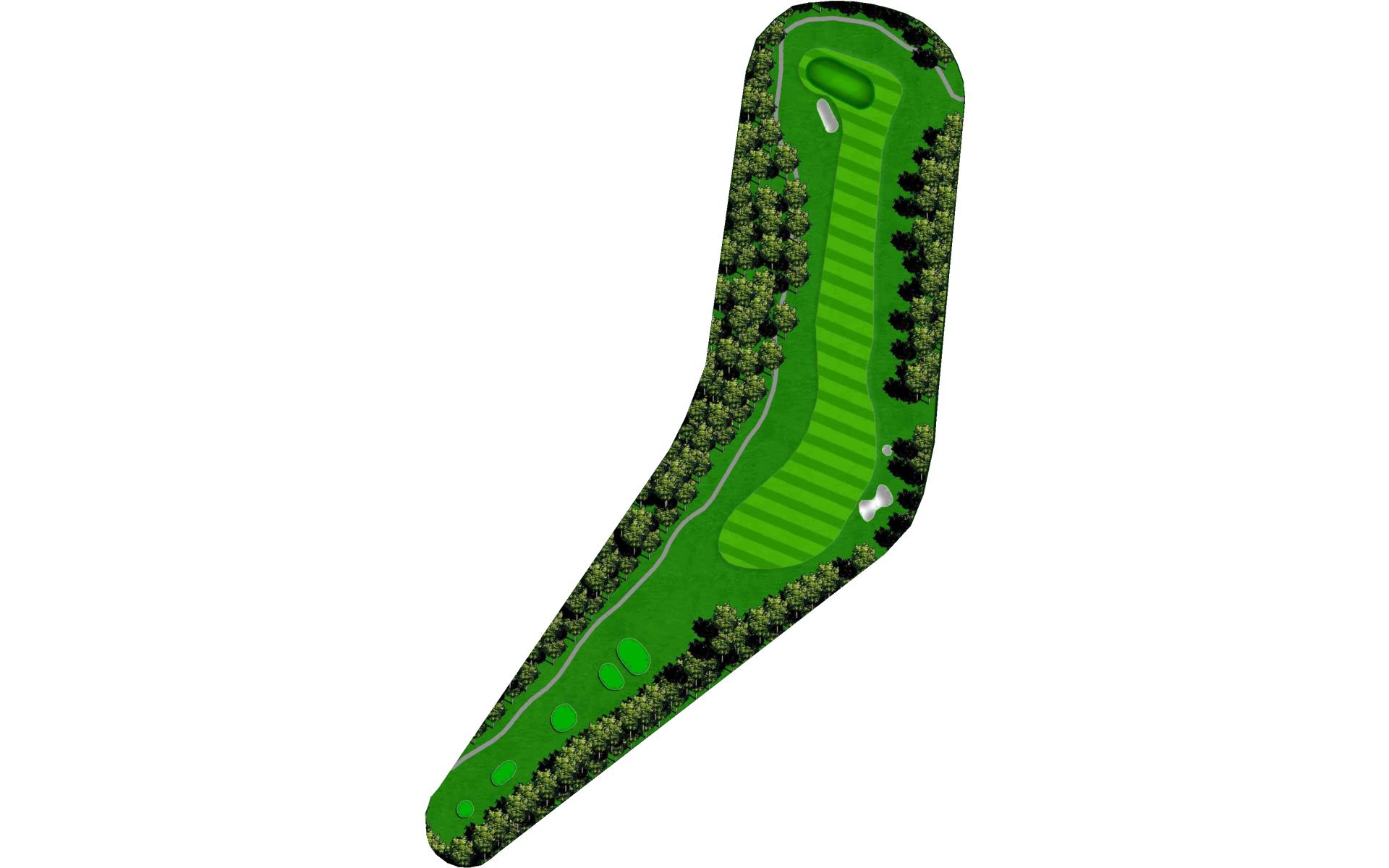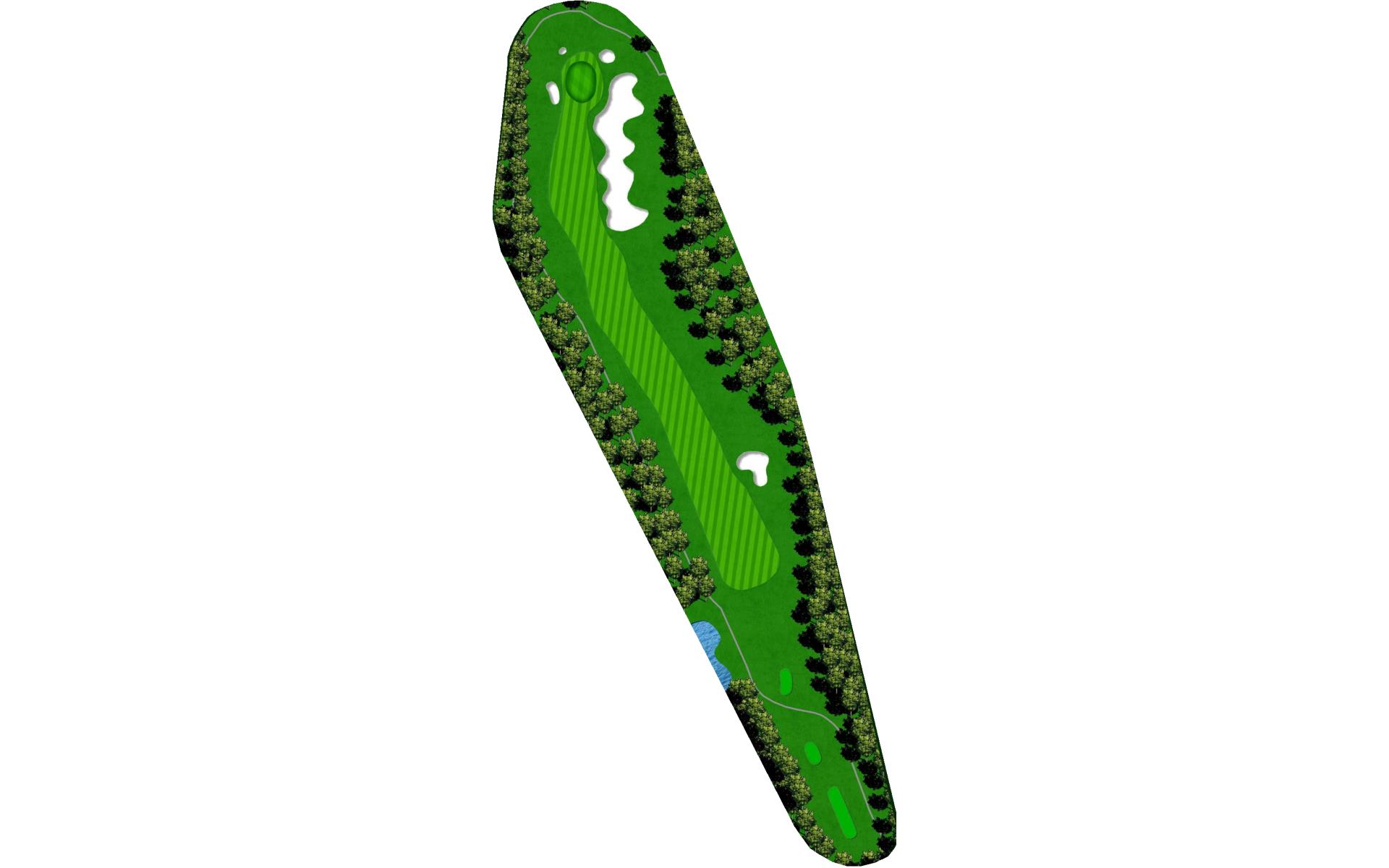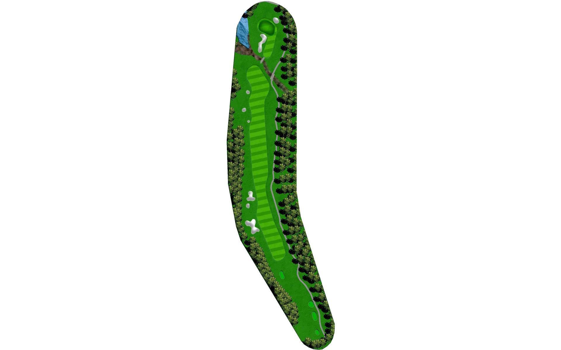 The last of the par 5s requires a good drive down the left center to have any chance at reaching it in two. The best way to approach this hole is to plan for a 3 shot routine. A good layup will leave a short wedge shot into a sloped green. The green is well protected with bunkers, but there is plenty of green to work with.